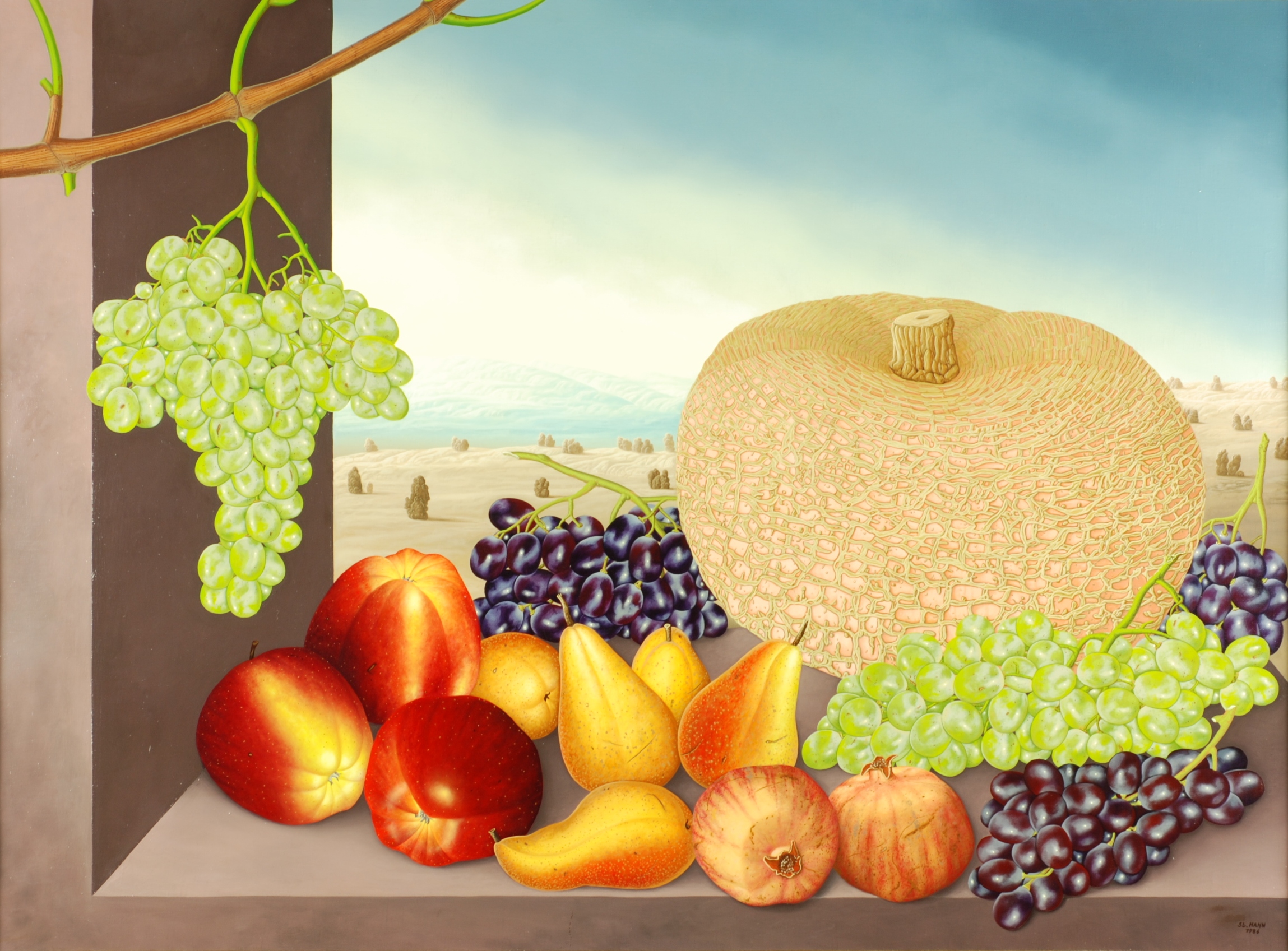 La nature morte d’hiver à la chicorée et au citron est représentée de manière réaliste. La chicorée et le citron sont présentés dans leur taille d’origine. La simple représentation du paysage et le ciel grisâtre mettent les fruits à l’honneur. La chicorée et le citron jouent les rôles principaux sur cette image. Le tableau a un ancien cadre vermoulu d’origine entièrement recouvert de feuille d’or.