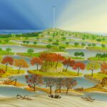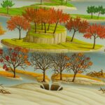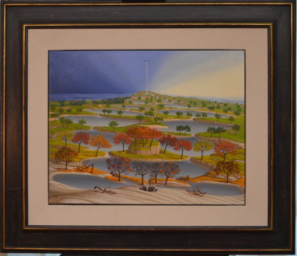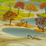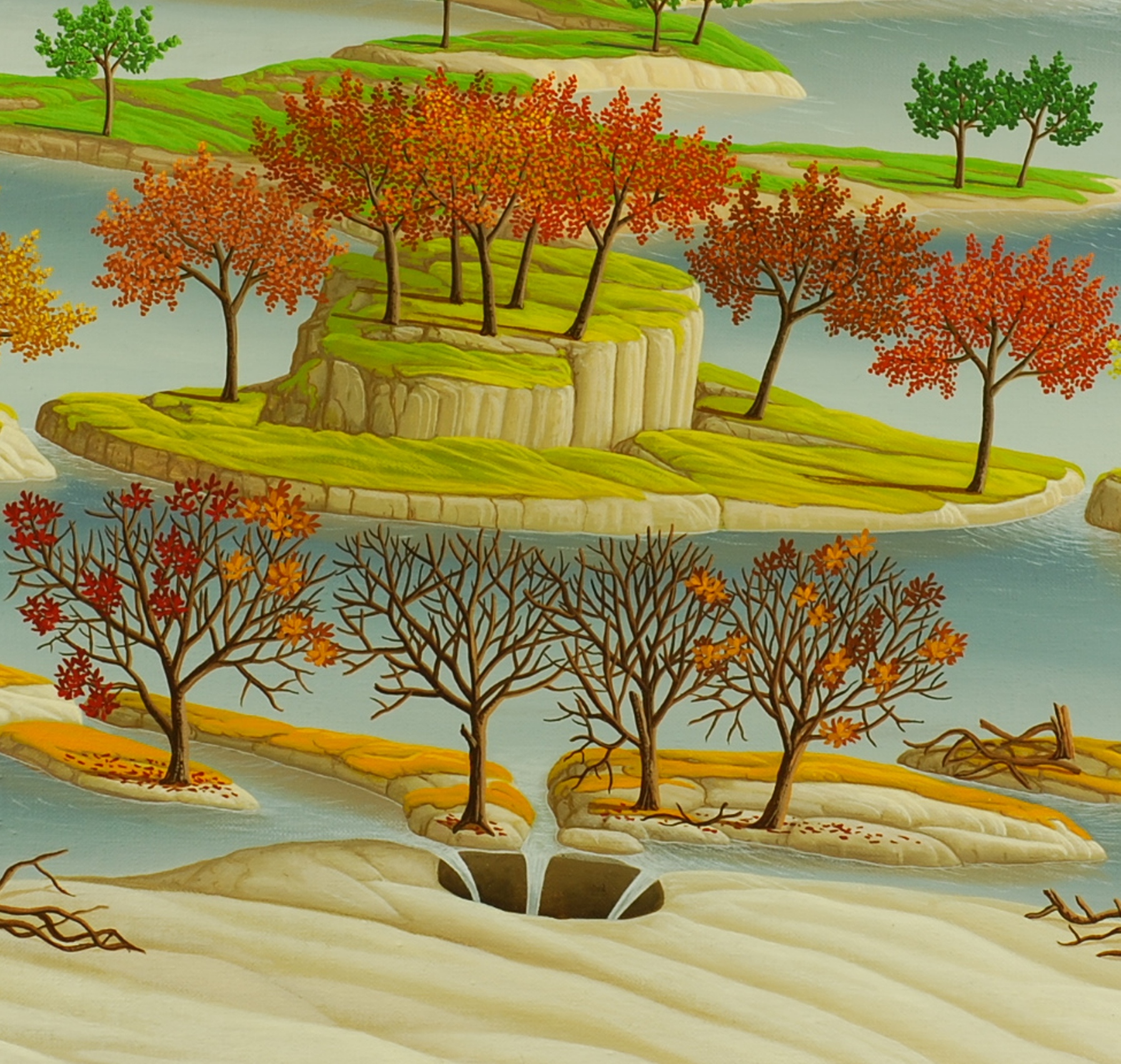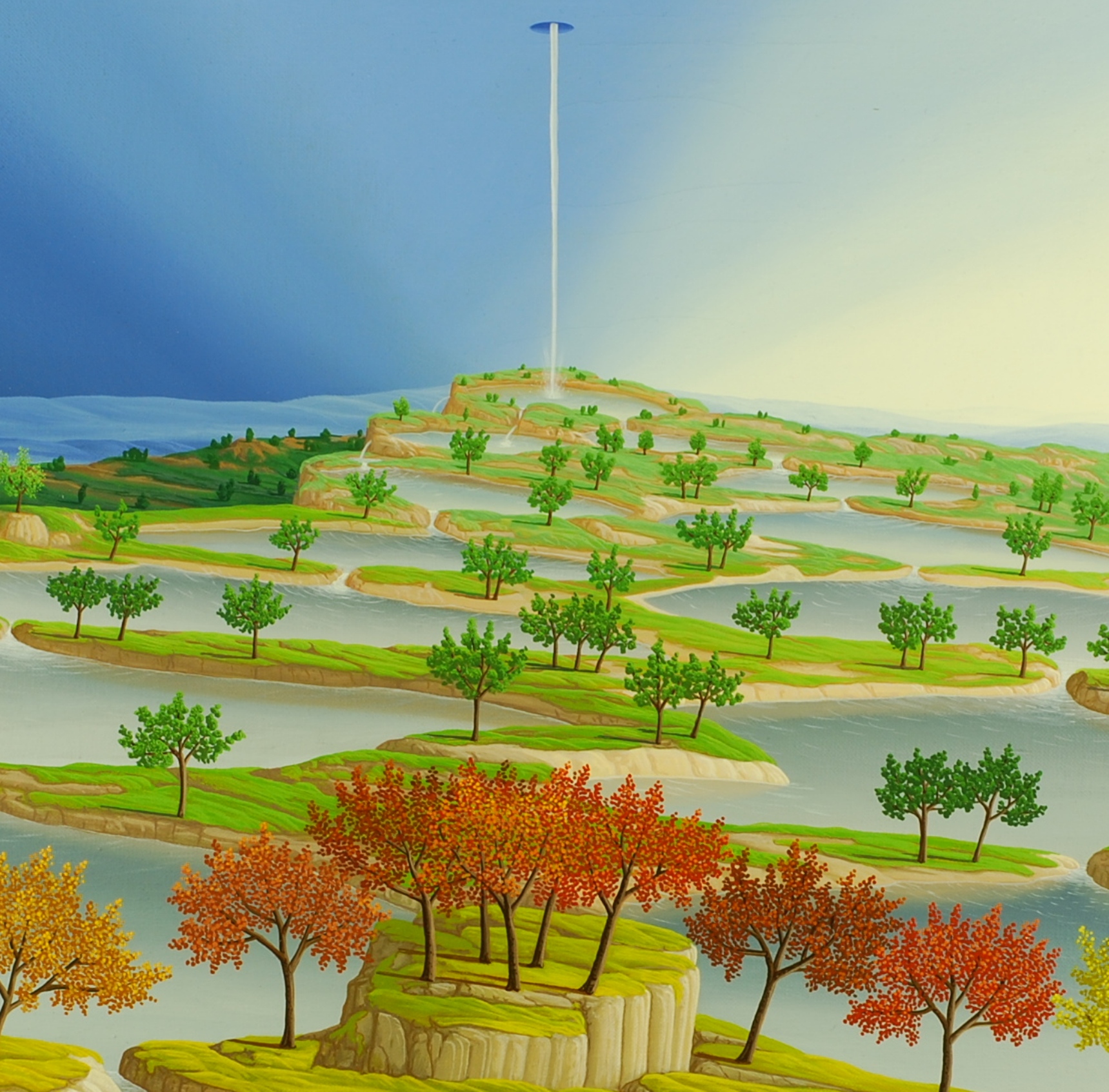 The focus of the picture is a landscape, the trees and the discolored foliage representing life or the life cycle. The life-giving water flows from the universe into the landscape and flows through the entire picture. In the foreground the water disappears into a hole in the earth. The water symbolizes the time, beginning and end, while it flows repeatedly through a colorful and appealing landscape.