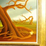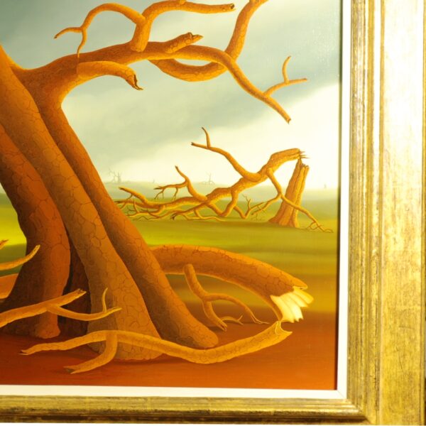 In the center of the picture is a large, destroyed tree after a storm. The sky still looks threatening, but the weather on the right edge of the picture is brightening. The little bird, not spotted directly and who survived the storm, is hoping for a wonderful sunny day. The painting has a custom-made model frame with gold applications.