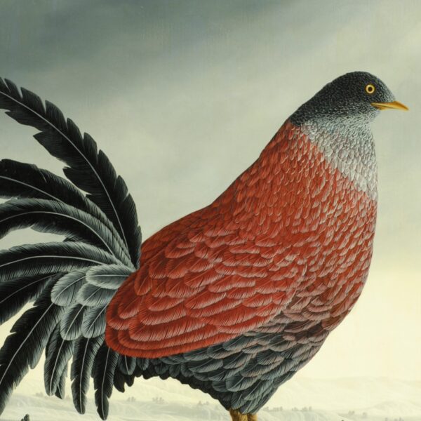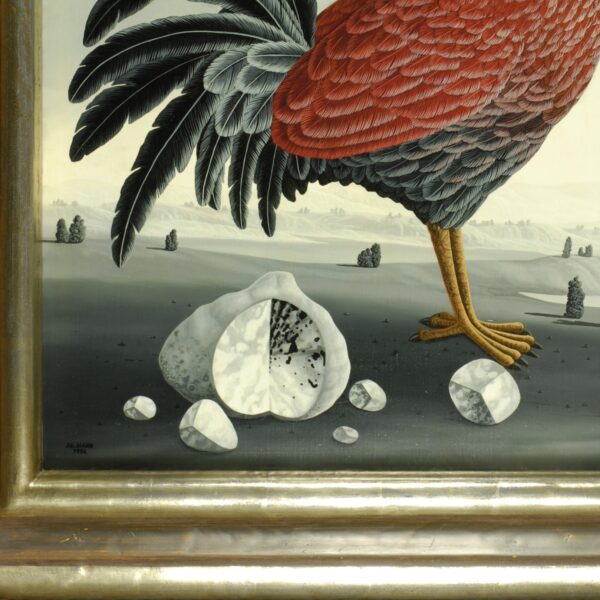 In the center of the oil painting is a large bird with magnificent plumage in various shades of gray and with red wings. Several stones of various sizes lie by its claws. The greyish landscape with few bushes and the gray sky make the magnificent bird shine even more imposingly. The painting has a custom-made model frame and is dated and signed on the front. The oil painting is titled, dated and signed on the reverse.