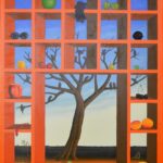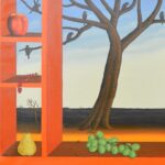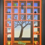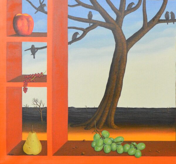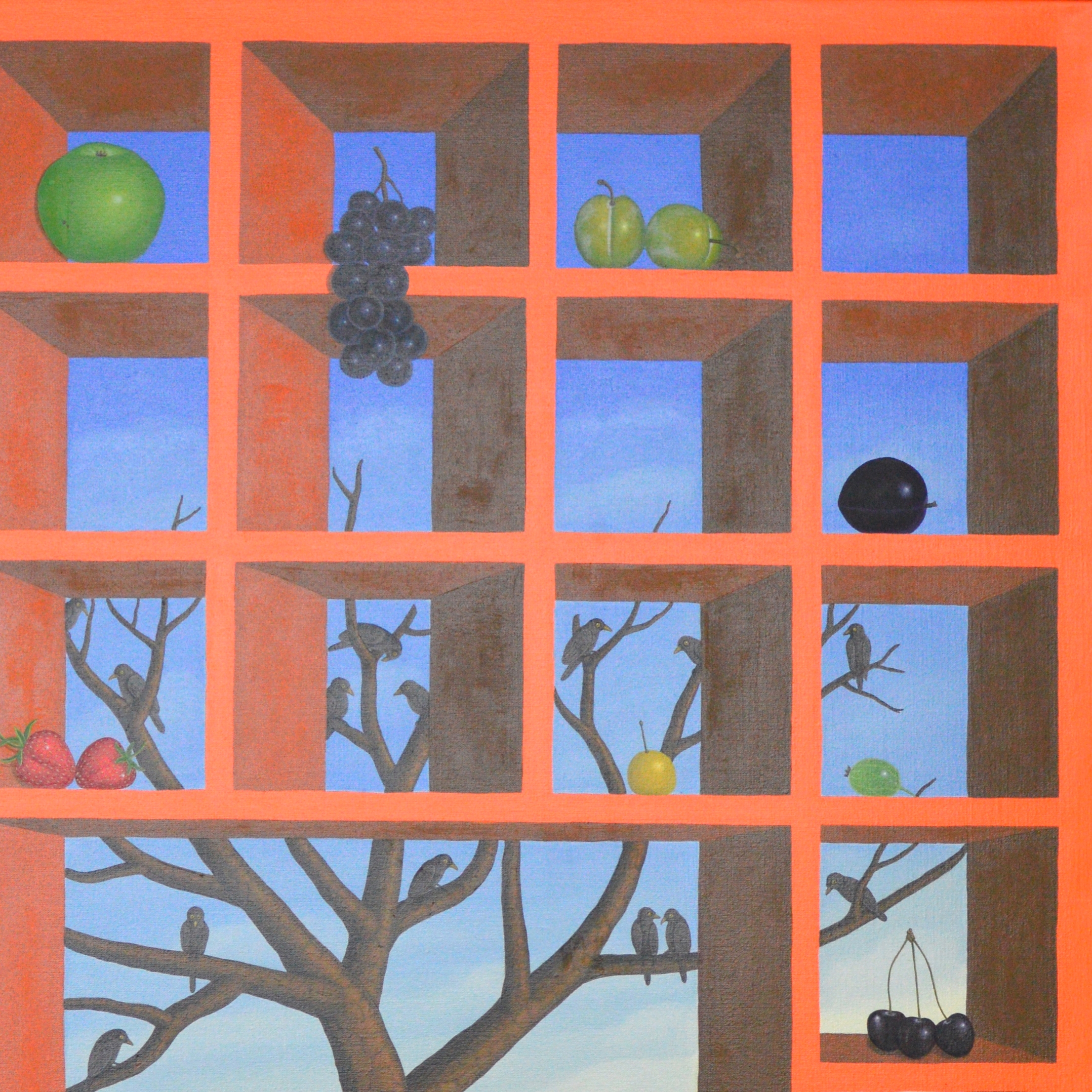 The oil painting is dominated by a large, red type case. This type case stands in front of a leafless tree with many birds and a desolate landscape with small trees. The individual boxes are filled with summer fruits. The fruits (pears, grapes, apricots, plums, apples, currants, strawberries, Reineclaude, mirabelle plums, gooseberries, peaches, cherries) are shown in their original size. The oil painting has a custom-made model frame and is dated and signed on the front. The painting is titled, dated and signed on the reverse.