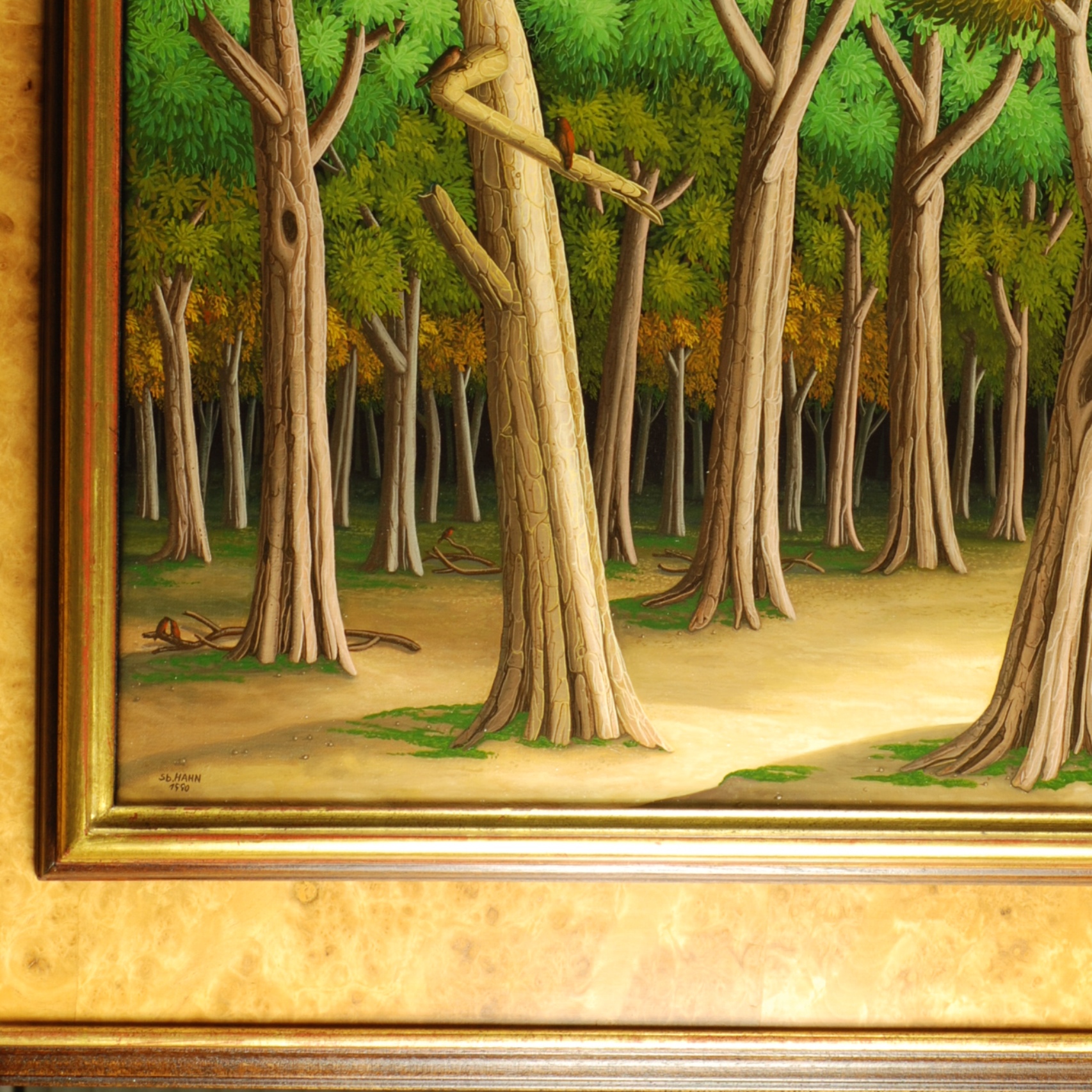 In the foreground of the picture are five trees in a small clearing. In the background there are many more trees and form the dense forest landscape. Small birds sit in some trees. The bright light of the rising sun breaks on the forest floor. The blue sky is literally pushed out of the picture by the many green leaves. The forest and the birds wake up this morning. The painting has a custom-made model frame with gold leaf application.