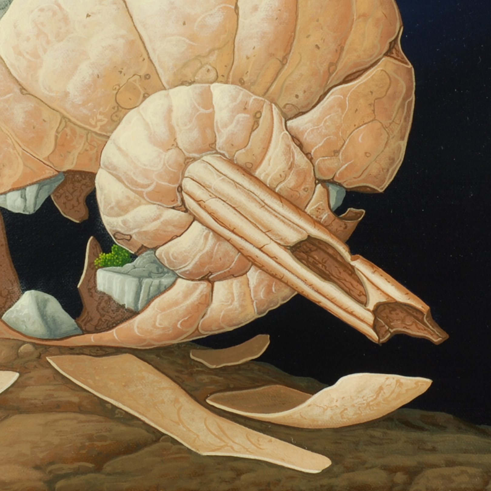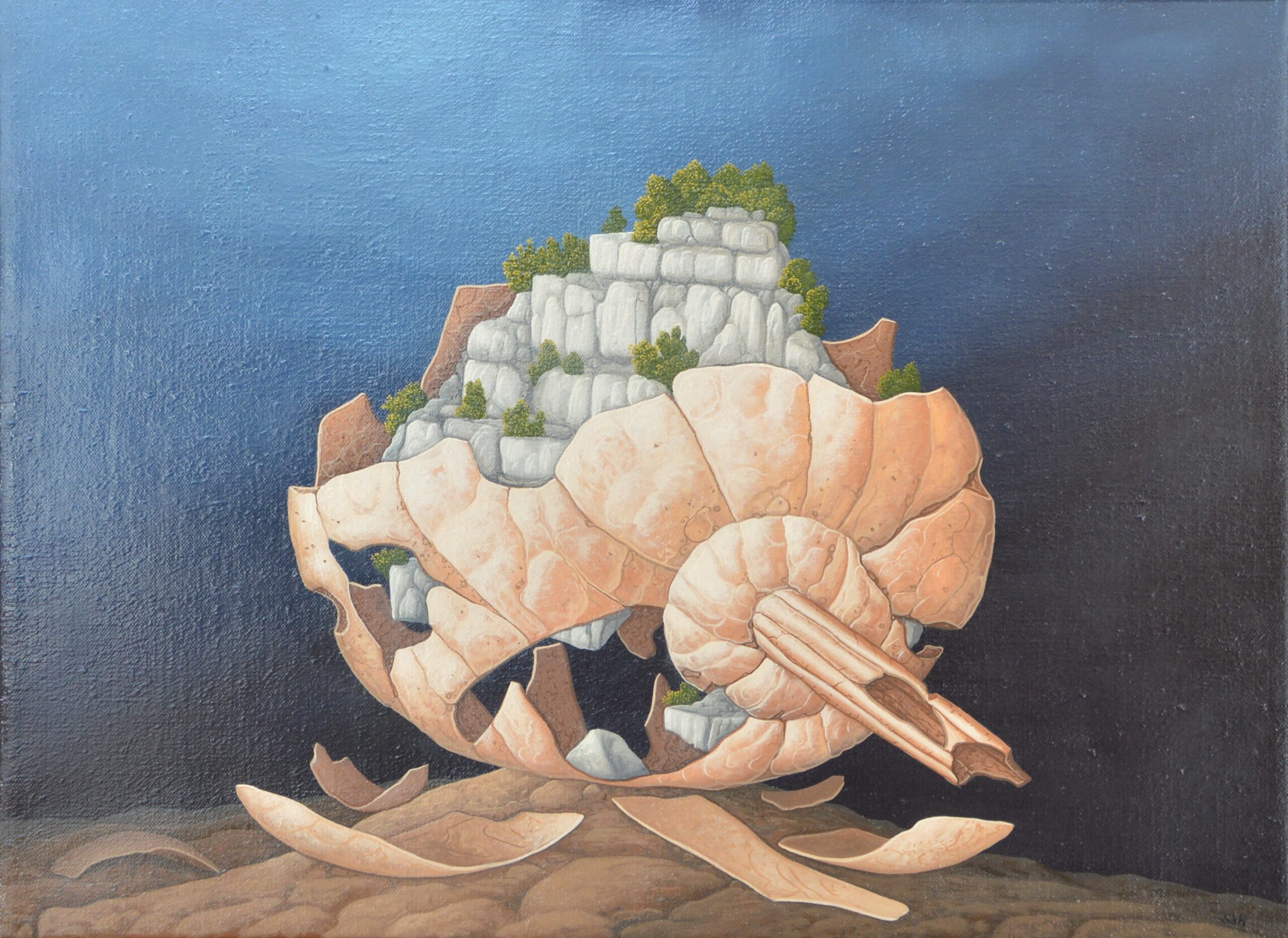 In the center of the oil painting is a huge type case. In the 21 smaller boxes there are different stones, semi-precious stones and crystals – the gifts from the earth’s interior. The large box in the center contains a few small stones and opens up a view of a volcano with a column of smoke in the background. The eruption of this volcano represents the origin of all the stones that are contained in the type case. The painting has a custom-made model frame (dimensions: 114 x 94 x 5 cm / height x width x depth) in the Gothic style and has gold leaf applications. The painting is dated and signed on the front and titled, dated and signed on the reverse.