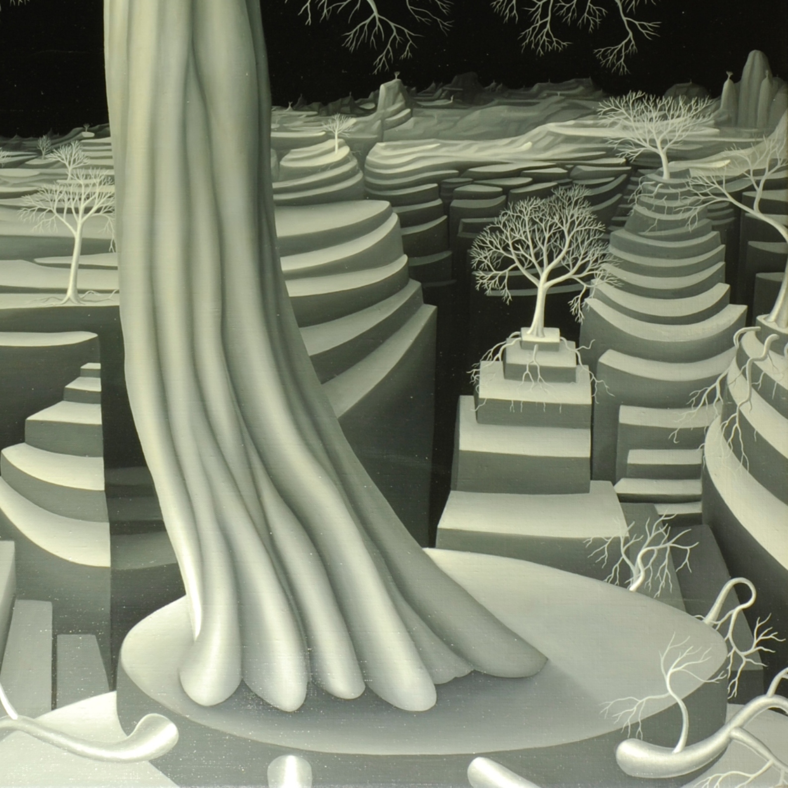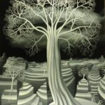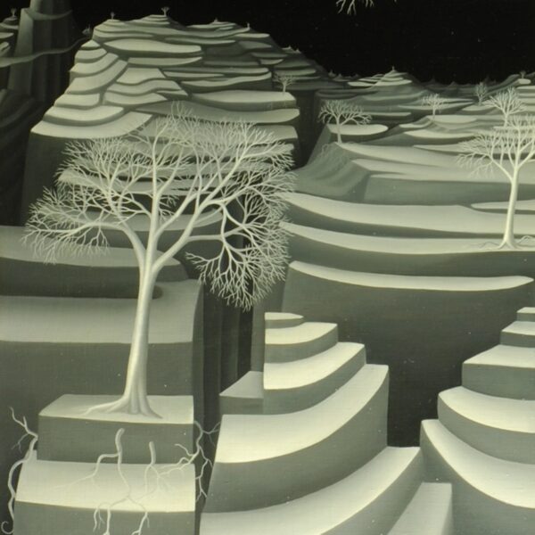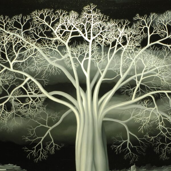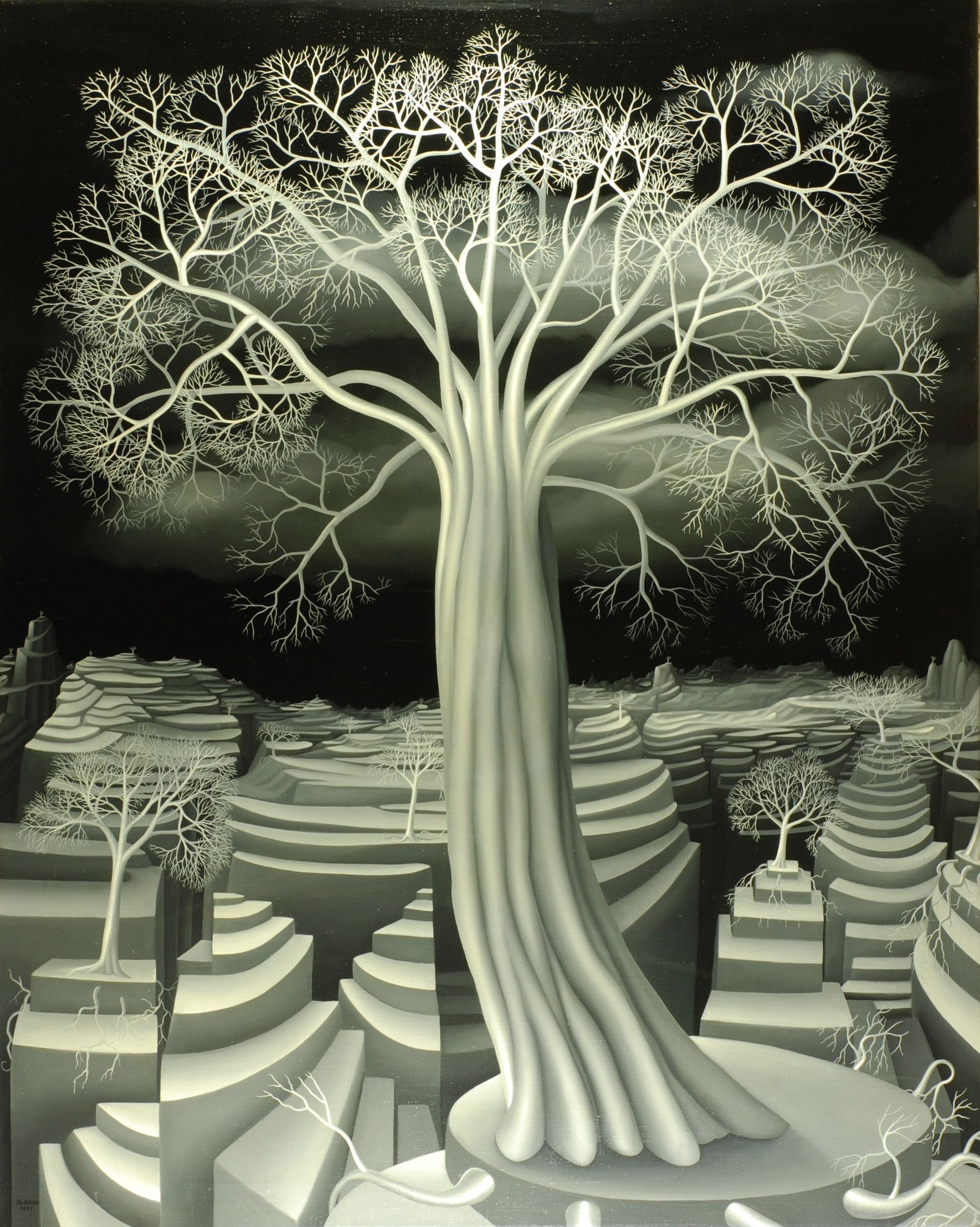 This black and white oil painting is convincing despite the lack of color in its representation. Several fantasy trees stand in the fragile terrace landscape. The main protagonist is a large fantasy tree that has found a safe place on a terrace island. The individual curved strands of the tree trunk flow into the imposing treetop. The black and white contrasting gives the tree a certain lightness. The painting has a custom-made model frame and is titled, dated and signed on the back.