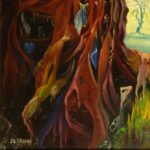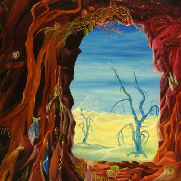 In the center of the painting is a grotto. The viewer stands shortly before the exit. The view through the entrance of the grotto allows a view of the outside world. Around the exit he sees pairs of eyes that belong to different shapes. The viewer believes he recognizes bodies, profiles or beings and gets lost in the corners of the grotto. The world in front of the grotto seems friendly, but the trees that can be seen seem rather strange. The painting has a custom-made model frame and is dated and signed on the title and back.