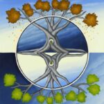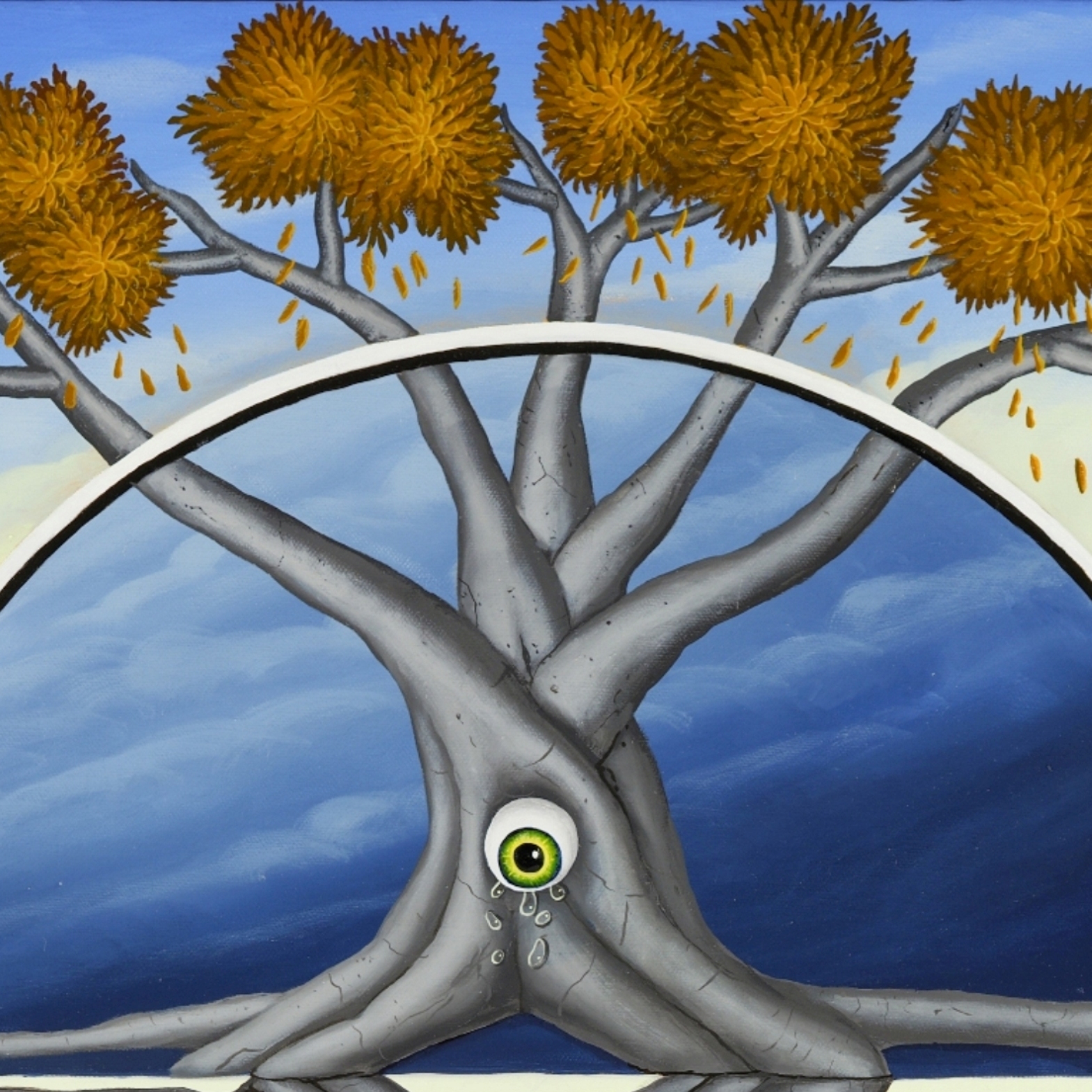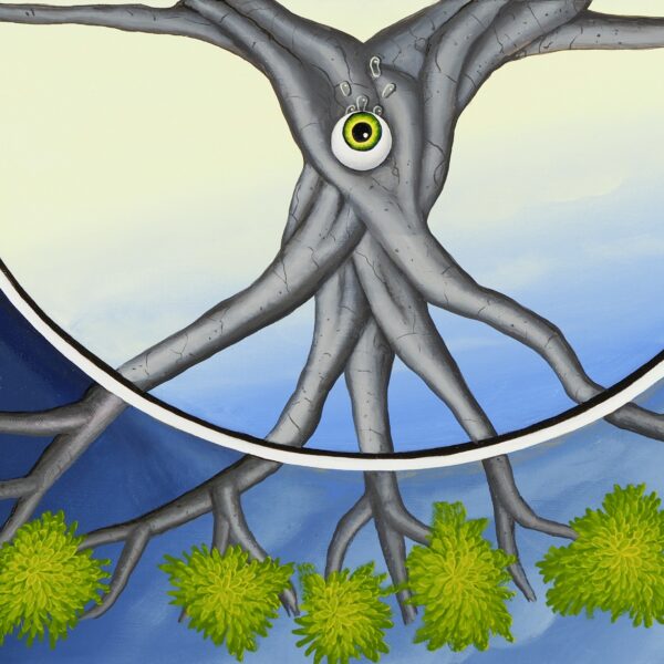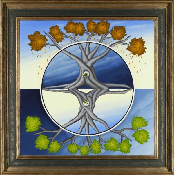 This painting plays with the contrast between two seasons: spring and autumn. The inner tondo (round picture) shows two mirrored tree trunks and branches. Two watery eyes look at the viewer from both tree trunks. Are they tears lamenting the loss of time? The tree tops with spring green or autumn colors are outside the tondo. The painting has a custom-made model frame with gold leaf applications and is dated and signed on the back.