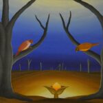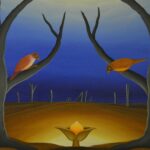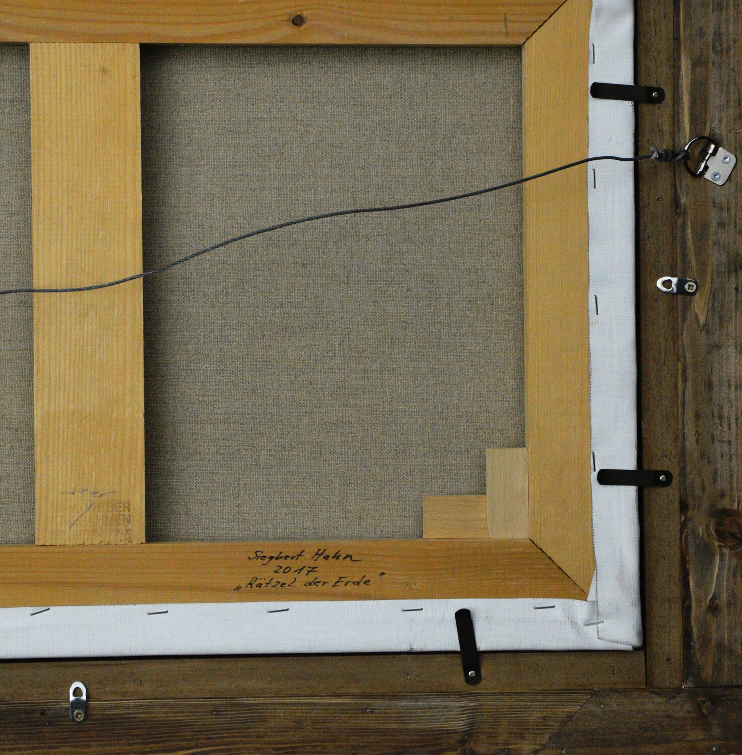The focus of the oil painting “Time changes life” are two trees: one with green leaves in a summer landscape and opposite (mirrored) another tree with brown leaves in an autumn landscape. The two tree trunks stand on small hills that are connected by a magic eye. The tondo is a circular image painted into a square painting. The two trees and their associated landscapes are mirrored at the center line of the circle. The circular picture was painted over a summer or autumn landscape. The painting has a custom-made model frame with gold leaf applications and is titled, dated and signed on the reverse. Dimensions with frame: 80 x 80 cm (HxW).