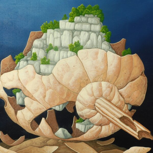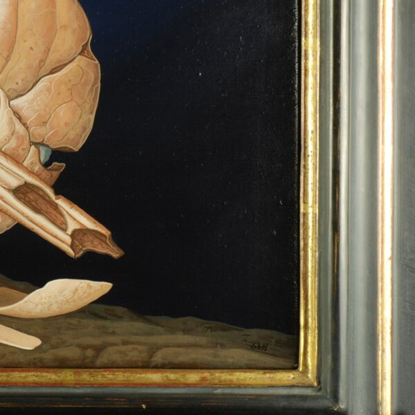 In front of a midnight blue sky lies a pumpkin-like fruit, the skin of which has burst in many places. A rocky landscape emerges, which is partly forested. The fragile fruit lies on a small hill. The oil painting has a custom-made model frame. The picture is signed on the front and titled, dated and signed on the back.