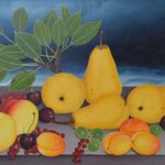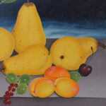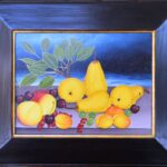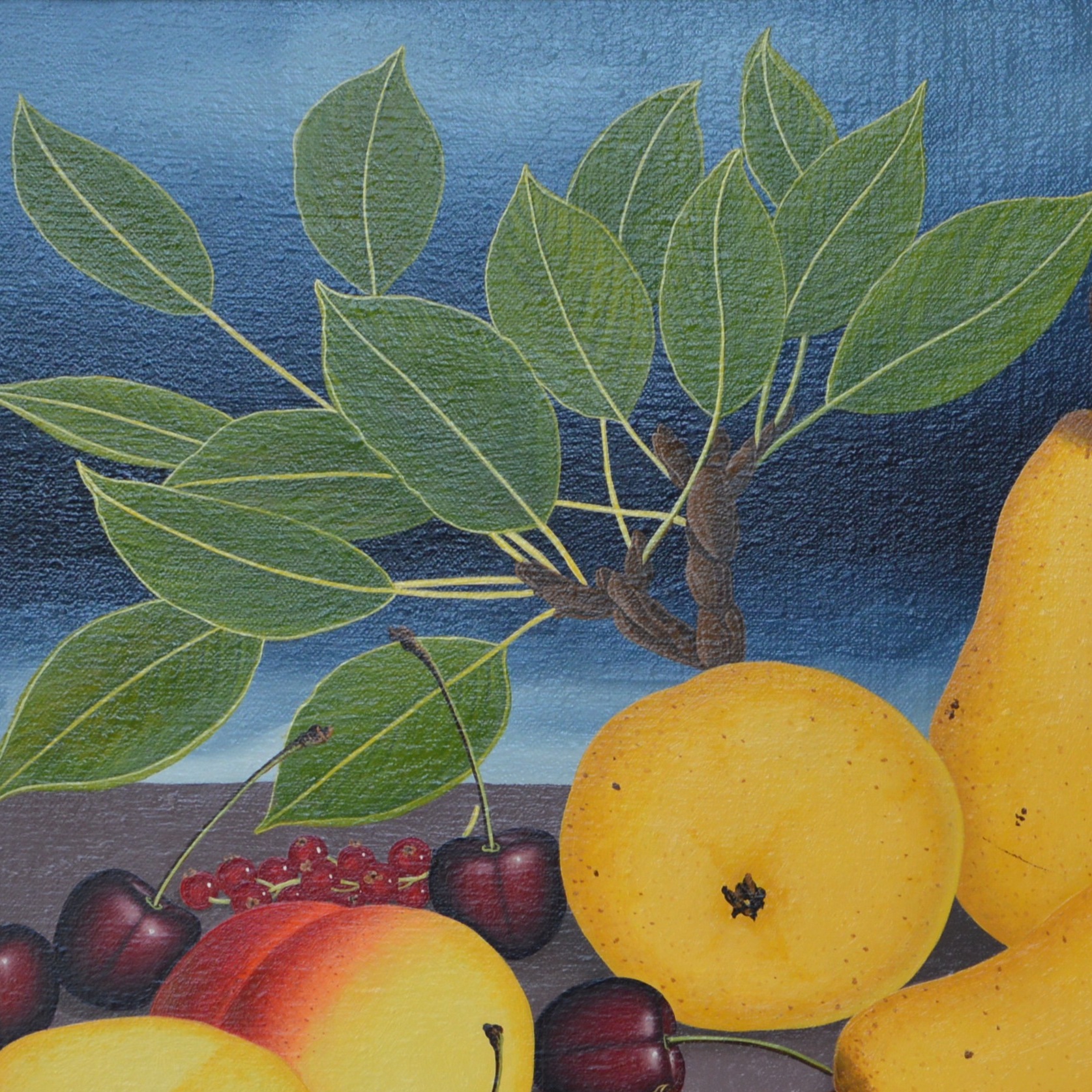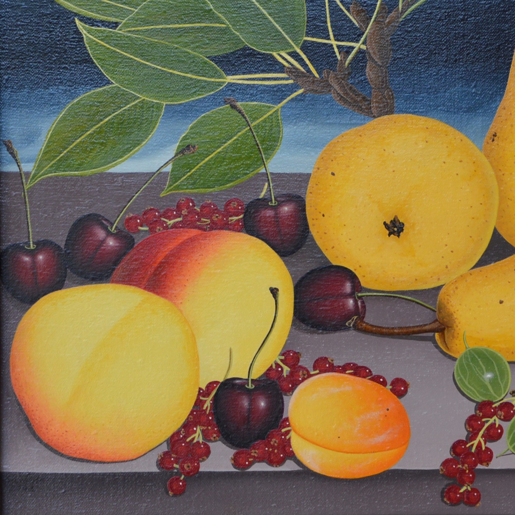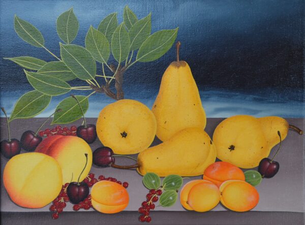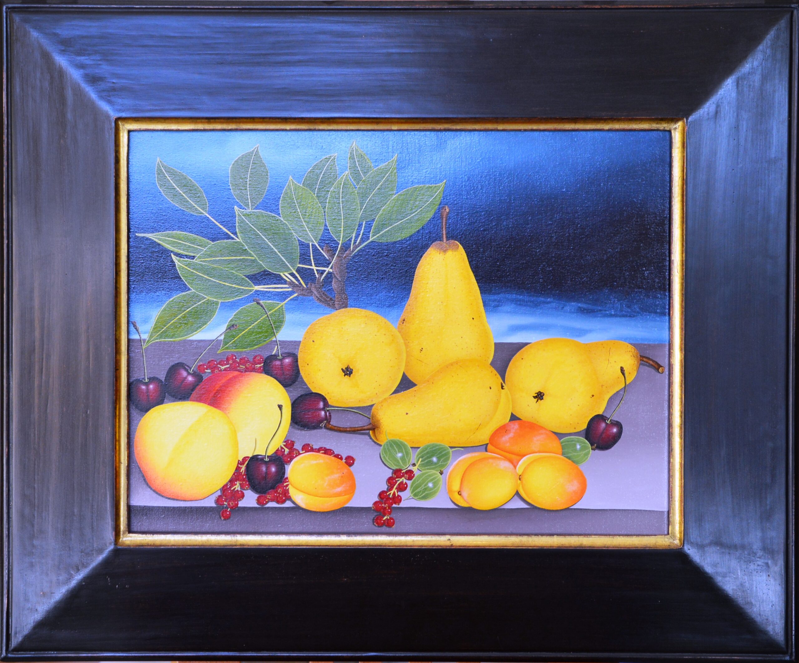 The still life with a pear branch consists of pears, cherries, gooseberries, currants, apricots and peaches. The fruit lies on a gray wooden plate in front of a bluish background, which makes the represented fruit shine. There is still a pear branch in the background. The fruits were all painted in their original size and therefore look very realistic. The oil painting has a custom-made model frame with applications of gold leaf. The painting is dated and signed on the reverse.