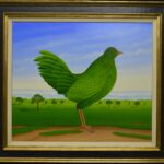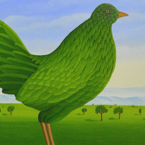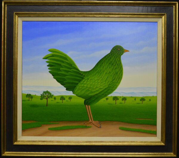In the center of the oil painting is a beautiful summer bird that proudly presents itself in its green plumage. The summer bird appears in front of a summery green landscape with deciduous trees and under a light blue sky. The winter bird is the counterpart to the summer bird – both paintings complement each other. Depending on how the two paintings are hung, the birds look at each other or turn their backs. The oil painting has a custom-made model frame with a passepartout. The painting is signed and dated on the front and back.