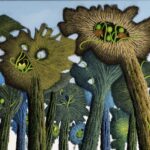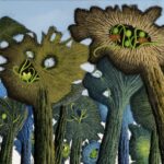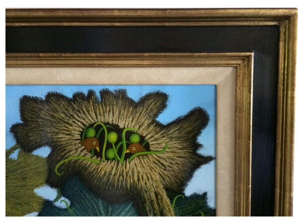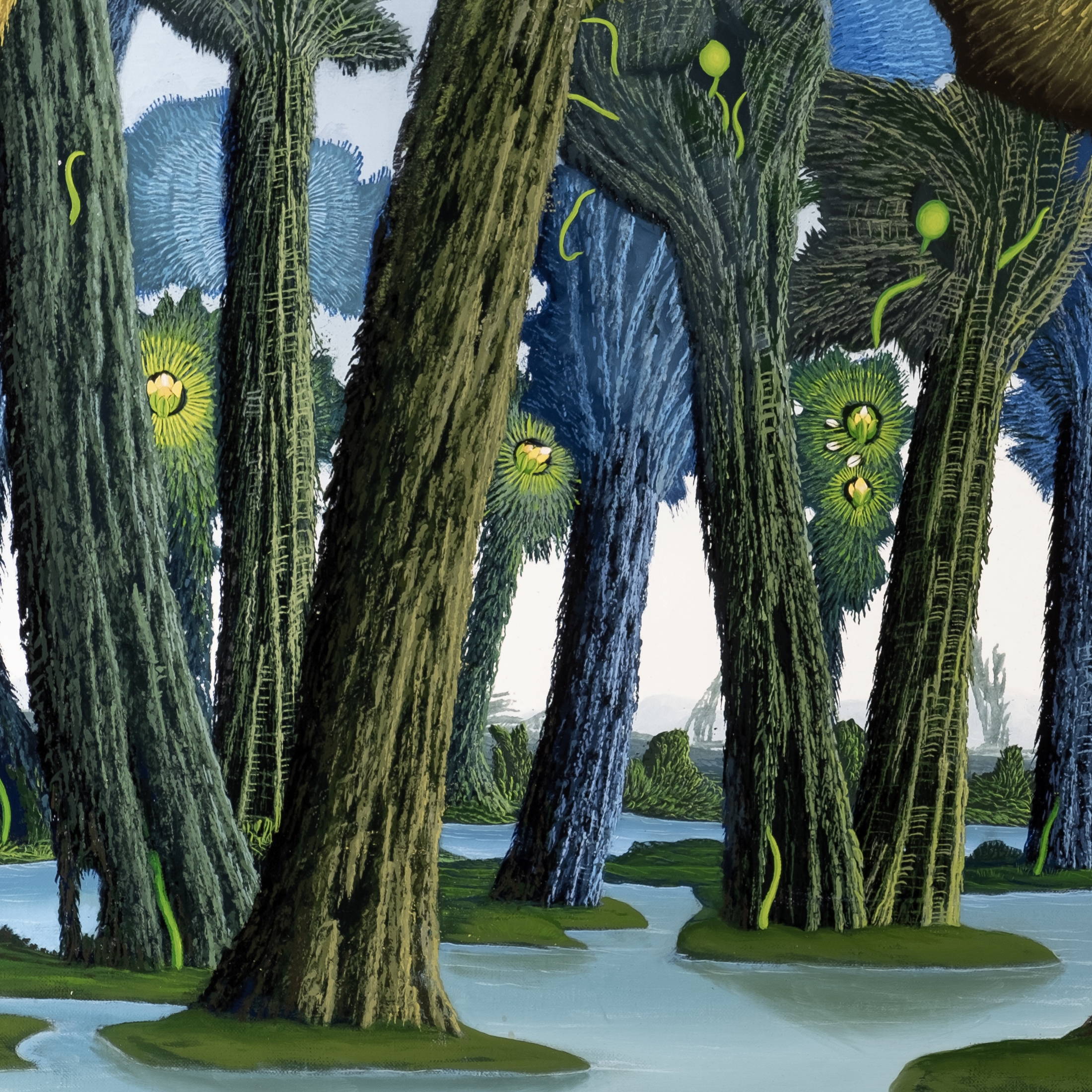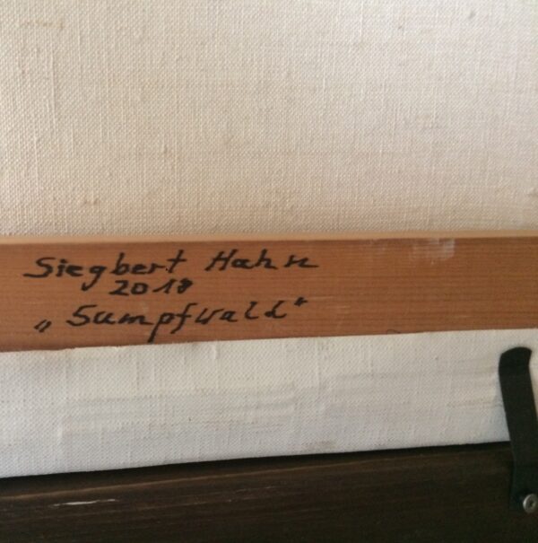 The oil painting shows a swamp landscape with fantastic trees. The trees grow on small islands in a lake and swamp landscape. The trees have no classic leaves, but treetops made of moss and lichen, from which colorful flowers sometimes grow. Two birds sit in a treetop. The painting has a custom-made model frame and is titled, dated and signed on the reverse.