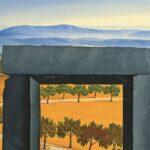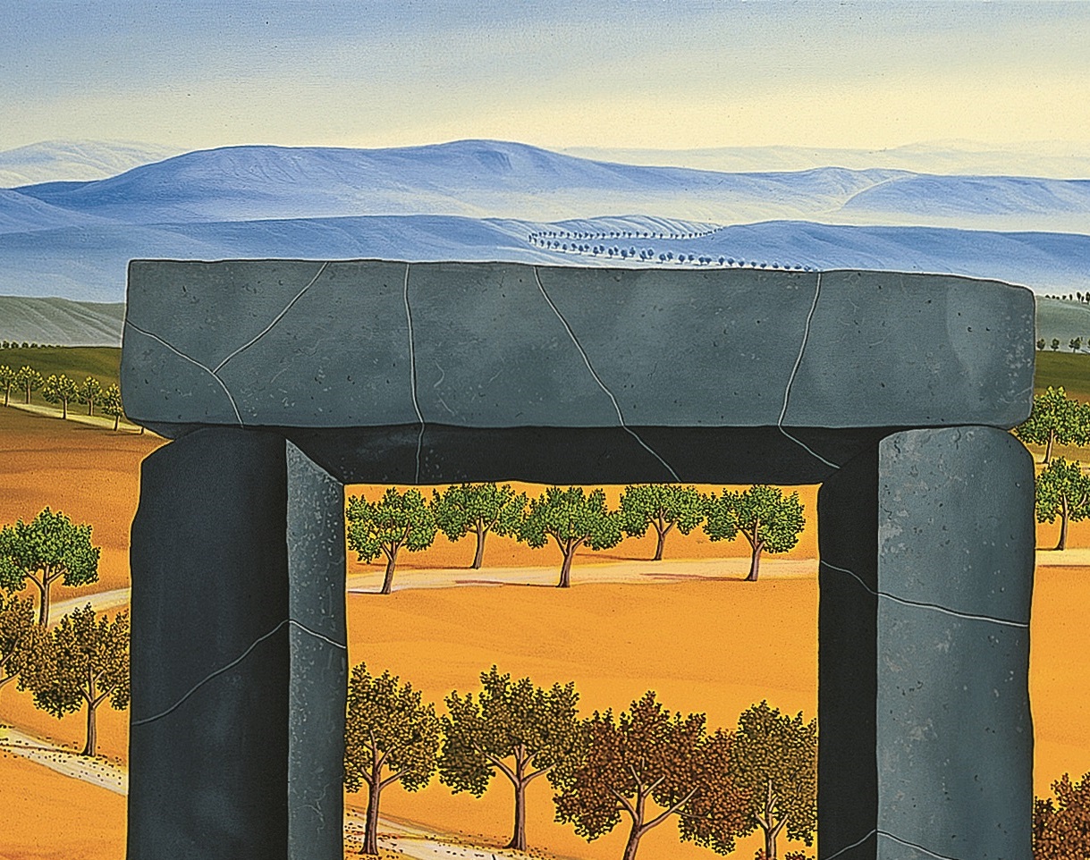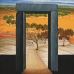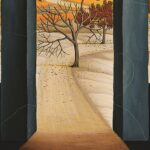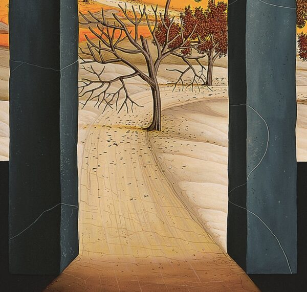 In the foreground of the picture is a gate made of dark gray stones. The path and the trees behind the stone gate are inviting until you realize that the dark gate is actually the last gate – at the end of life. The long path and the colorful trees that lie in front of the dark gate change their foliage color with the length of the path from fresh spring green (in the distance) to lush summer green (in the middle part) to autumn colors at the end of the path. The painting has a custom-made model frame.