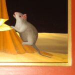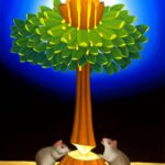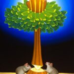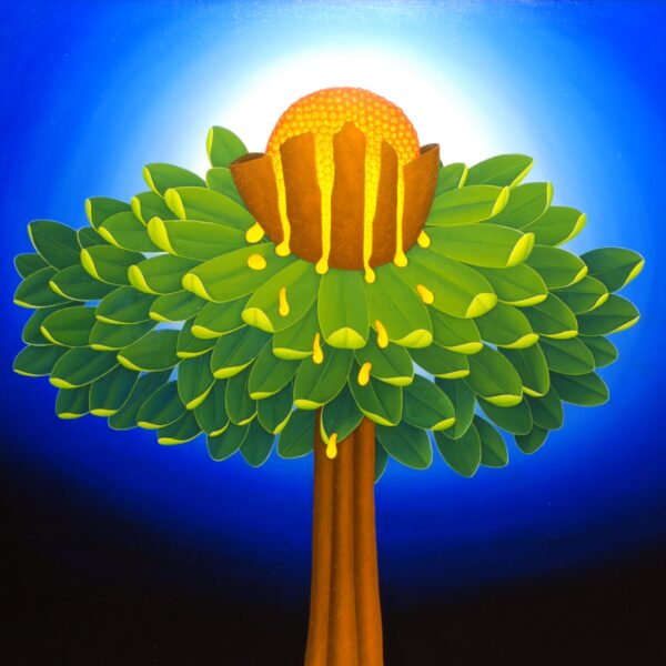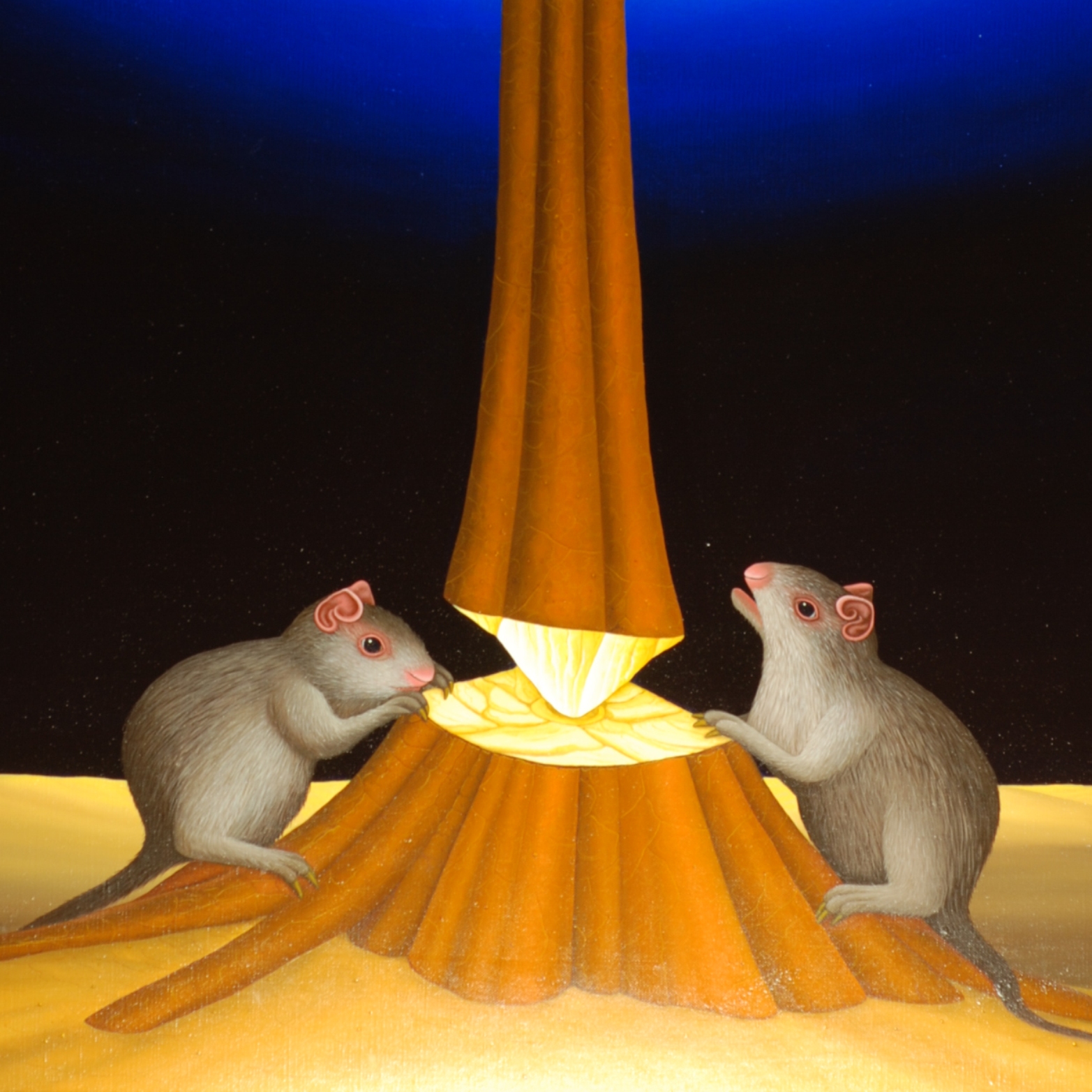In the center of the picture is a fantasy tree with a crown of leaves with a special fruit. Only at second glance do you notice the two rodents trying to get the fruit of the fantasy tree by bringing the tree down. The black and blue background makes the fruit and the fantasy tree look even more mysterious. The painting has a custom-made model frame with applications of gold leaf and is signed and dated on the front and back. The oil painting has the dimensions including the frame: 124 x 94 cm (height x width).