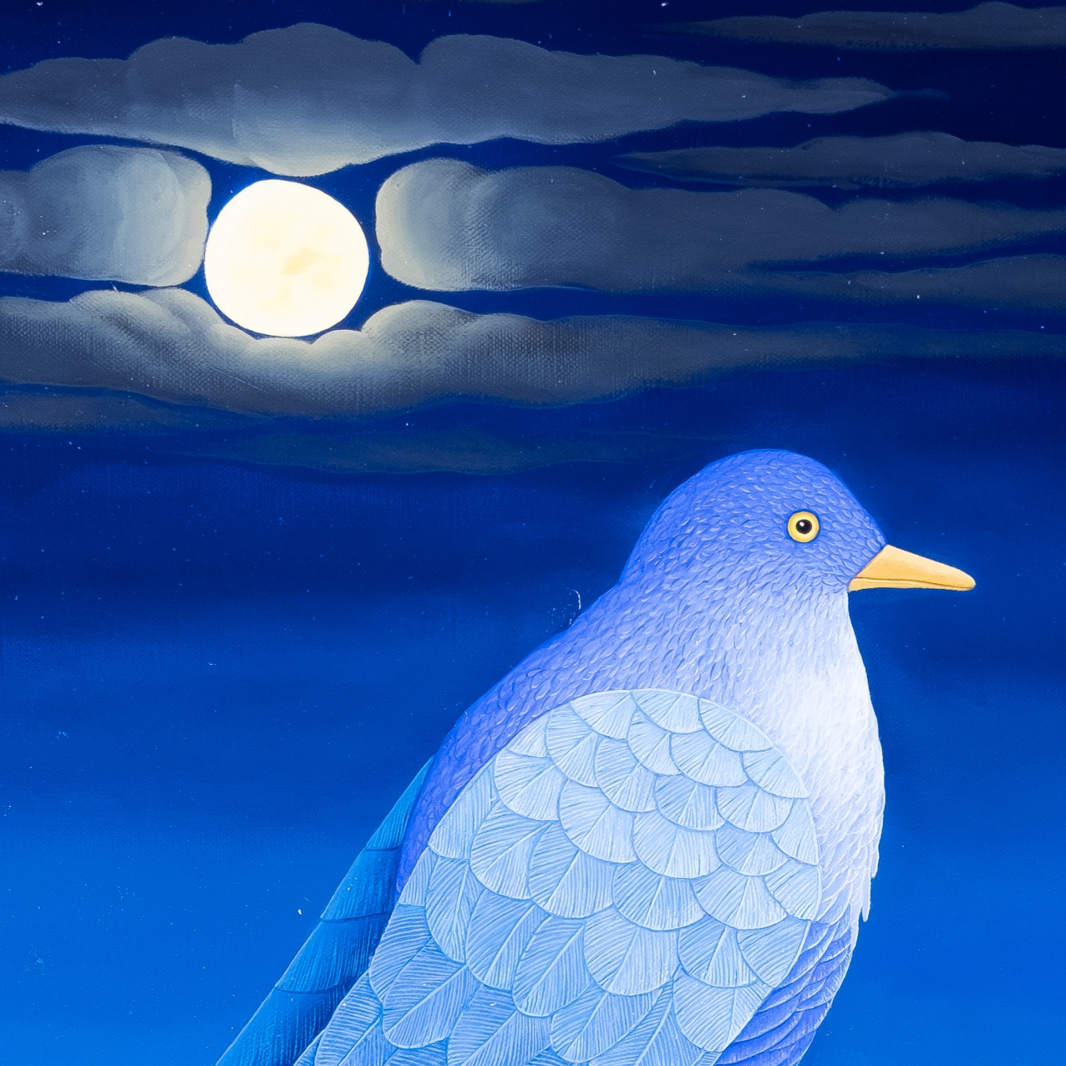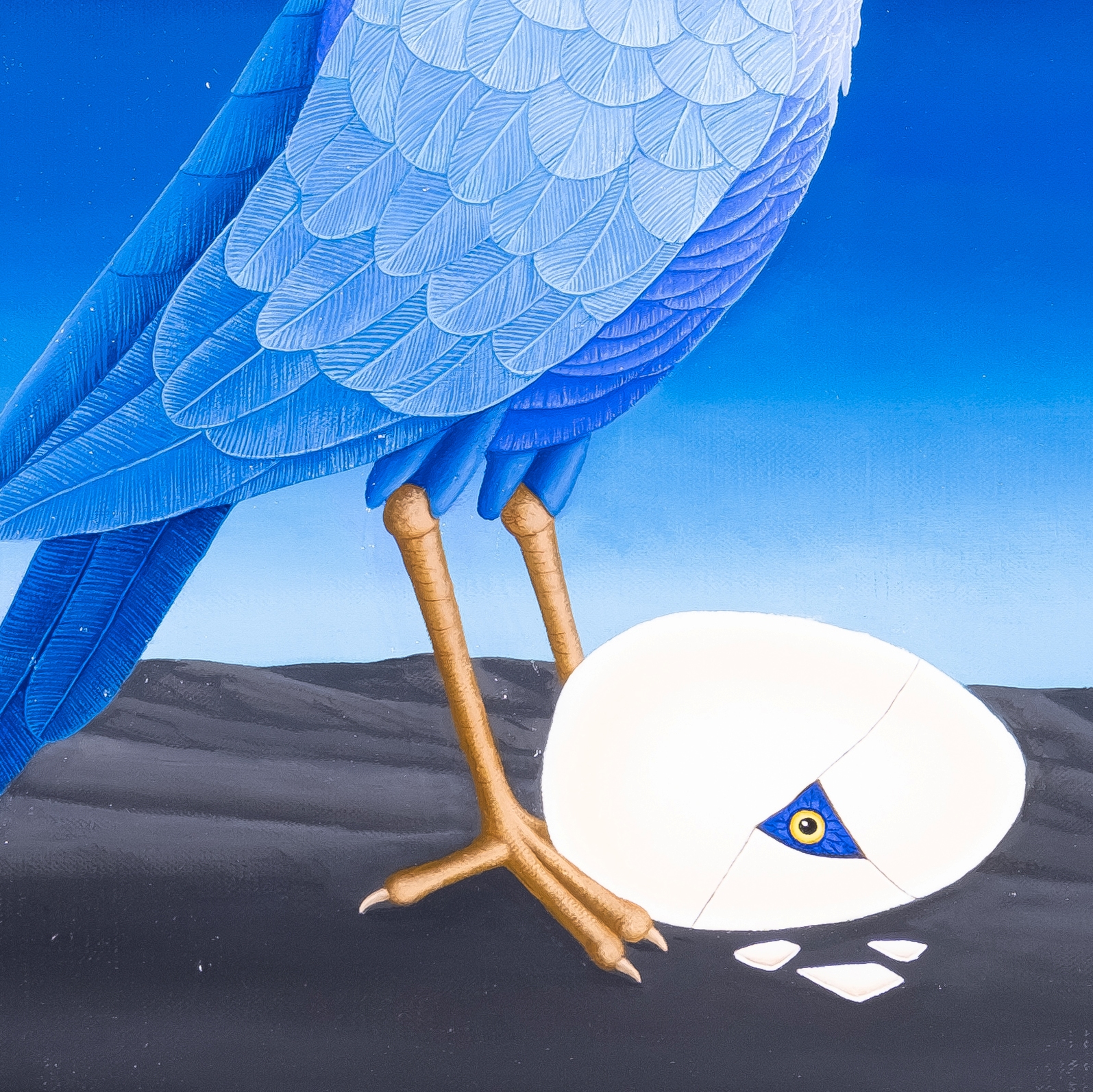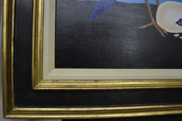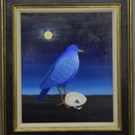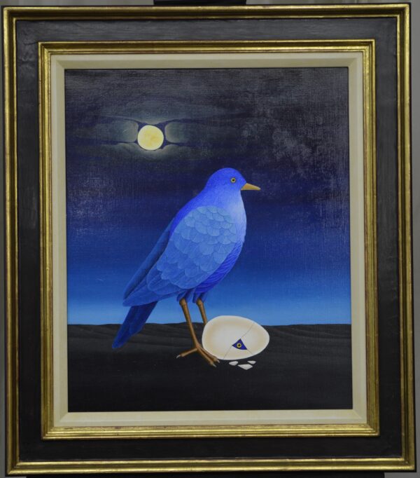 A bird in the night guards its egg with a chick just hatching. From the egg, the shell of which is broken, one eye looks into the gray and dark night. Only the moon illuminates the moonbird’s dark night. The deep blue bird is waiting for the offspring to hatch. The painting has a custom-made model frame and is titled, dated and signed on the back.