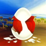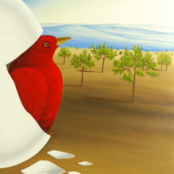 In the center of the painting are two birds hatching from an egg. Two birds mature in the egg. They want to hatch and are faced with different perspectives. Destroyed trees and darkness can be seen on one side and light and life on the other. The dark and light sky underlines the different perspectives. The oil painting has a custom-made model frame and is dated and signed on the front and back.