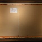 The oil painting “The Last Tree” shows a leafless tree with bare branches. There are broken branches around the trunk of the tree. In the trunk of the tree you can see a crying eye. The landscape behind the tree is rather friendly but still bare – no other tree, plant, animal in sight. The painting has a painted passe-partout and a custom-made model frame with gold leaf applications. The oil painting is signed and dated on the front. The painting is titled, dated and signed on the back. Dimensions with frame: 87 x 77 cm (HxW)