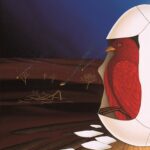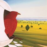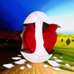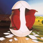 In the center of the oil painting are two red birds sitting together in a bursting egg. The broken shell lies in front of the egg. Half of the egg stands in front of the destroyed and half intact landscape. The left side stands for destruction and the right side stands for landscapes in bloom. As soon as the birds leave the egg completely, one of them will live on in a ruined, inhospitable world, while the other bird will have better luck. The painting has a custom-made model frame and is dated and signed on the front. In addition, the artist has titled, dated and signed the painting on the back.
