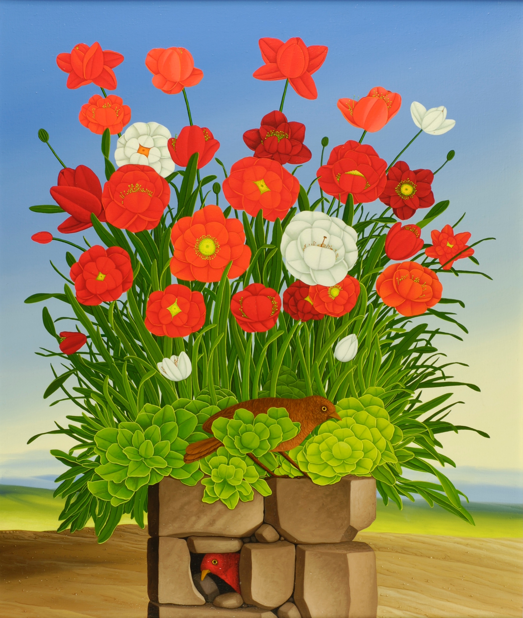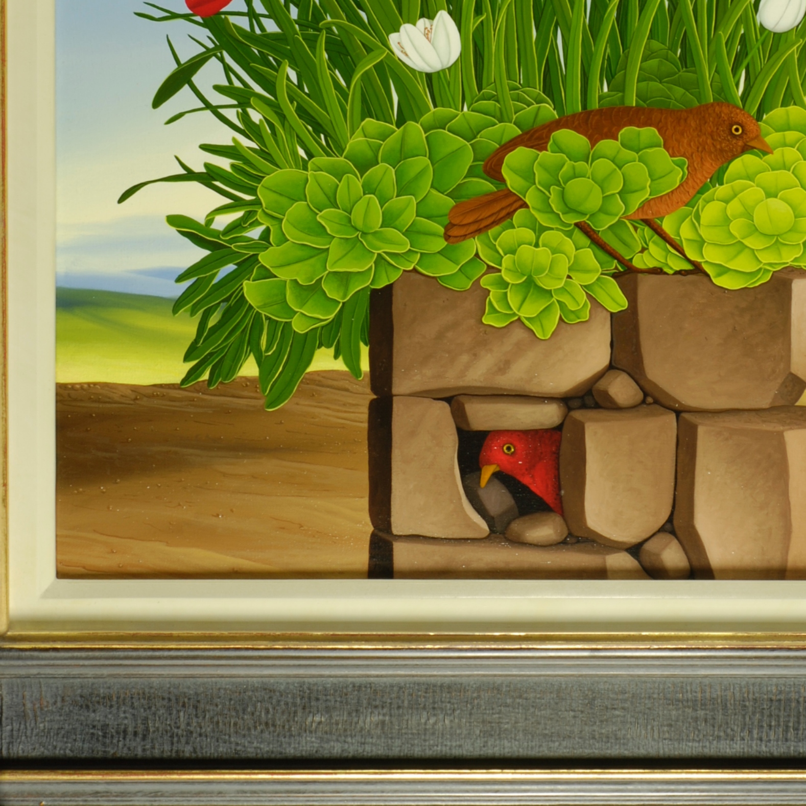 The focus of the summery picture is a blooming bouquet of red and white flowers. There are two brown birds in the picture. One bird sits in the green bush of flowers and the other bird sits protectively in a cave in the boulder. The flowers grow on a boulder. The light blue sky and the bright colors of the flowers as well as the two birds add to the peaceful mood of the picture. The painting has a custom-made model frame and is dated and signed on the front.
