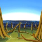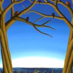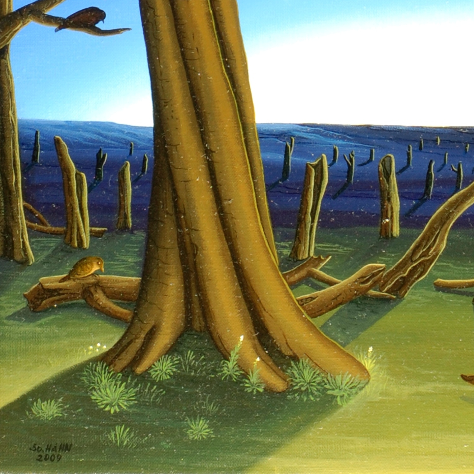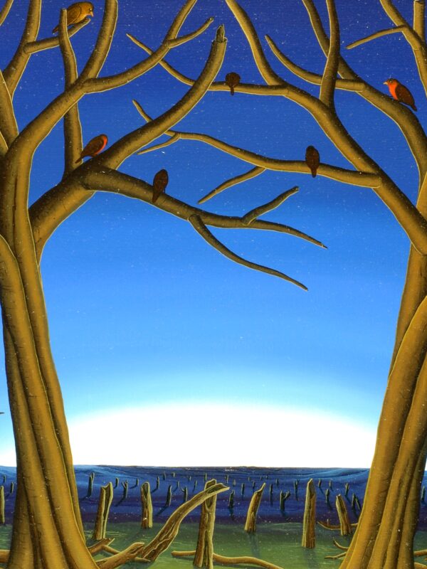 In the center of the barren landscape are two trees without leaves. Birds sit on the branches and wait for the light, which can already be seen as dawn on the horizon. The light or the rising sun stands for life and the hope that is connected with it. Life needs hope. The birds symbolize life. The painting has a custom-made model frame.