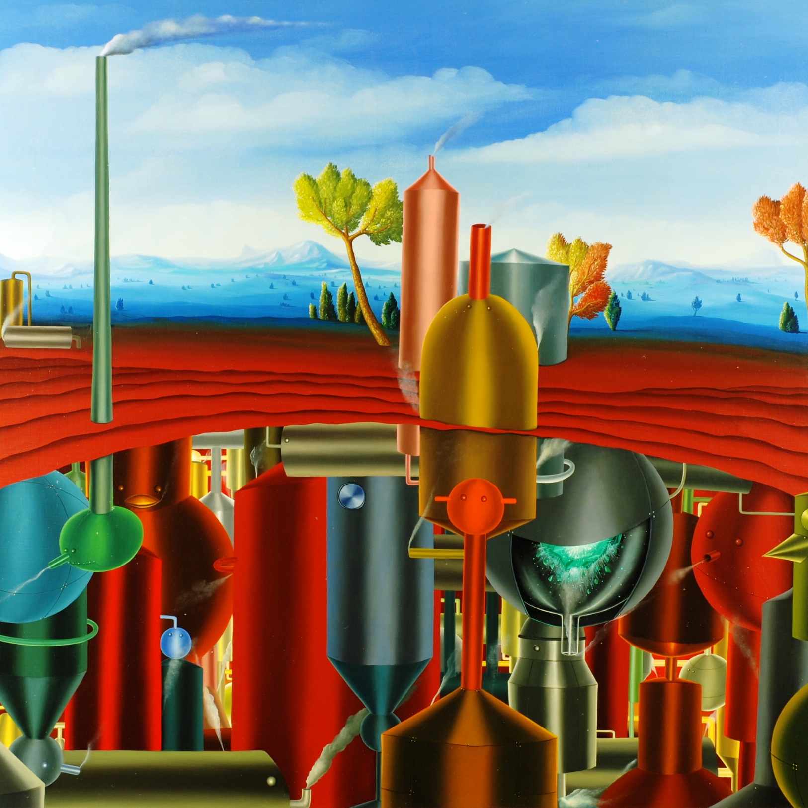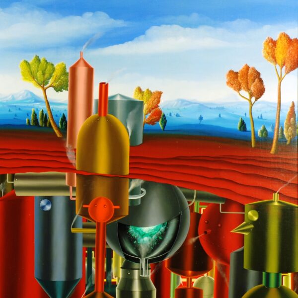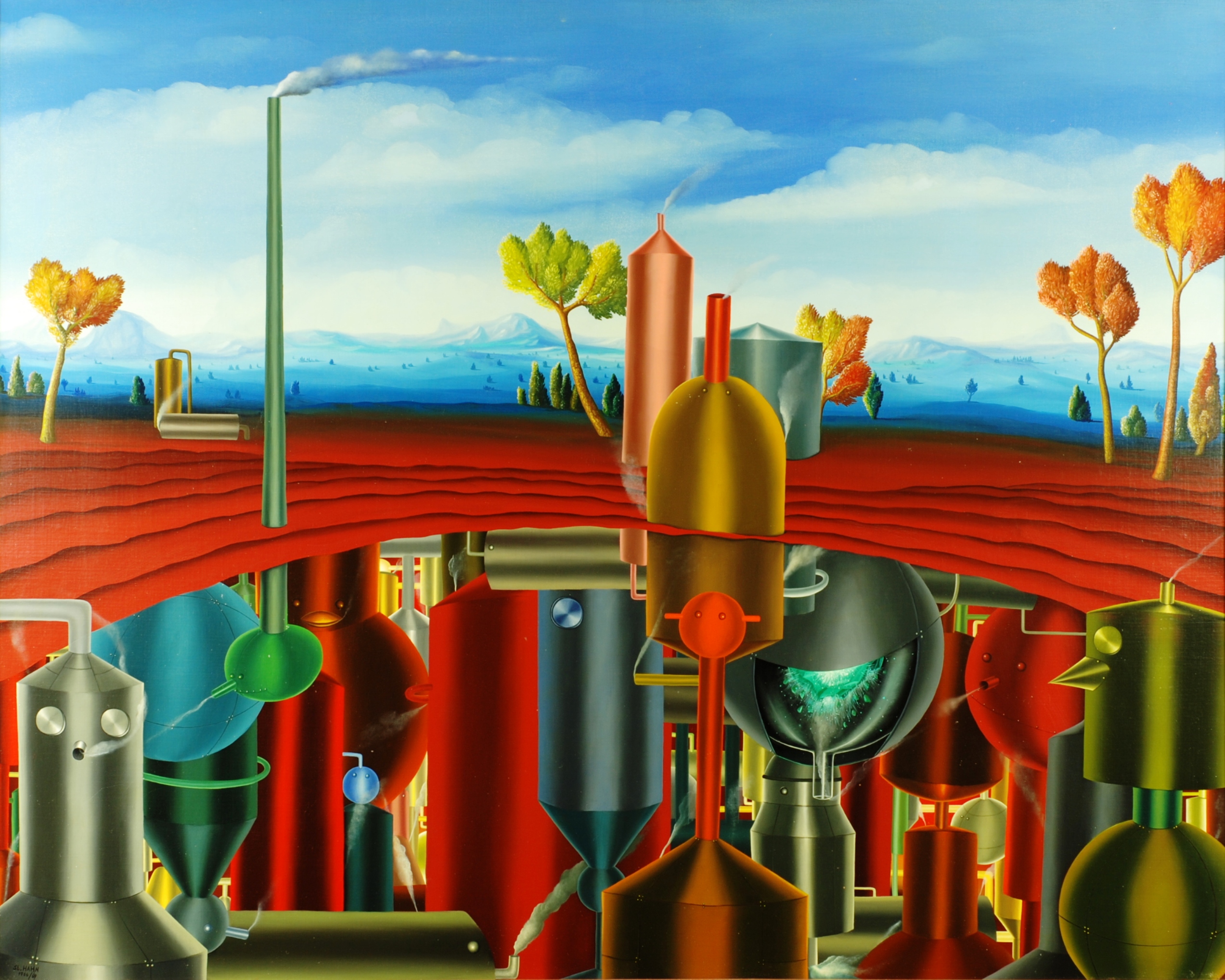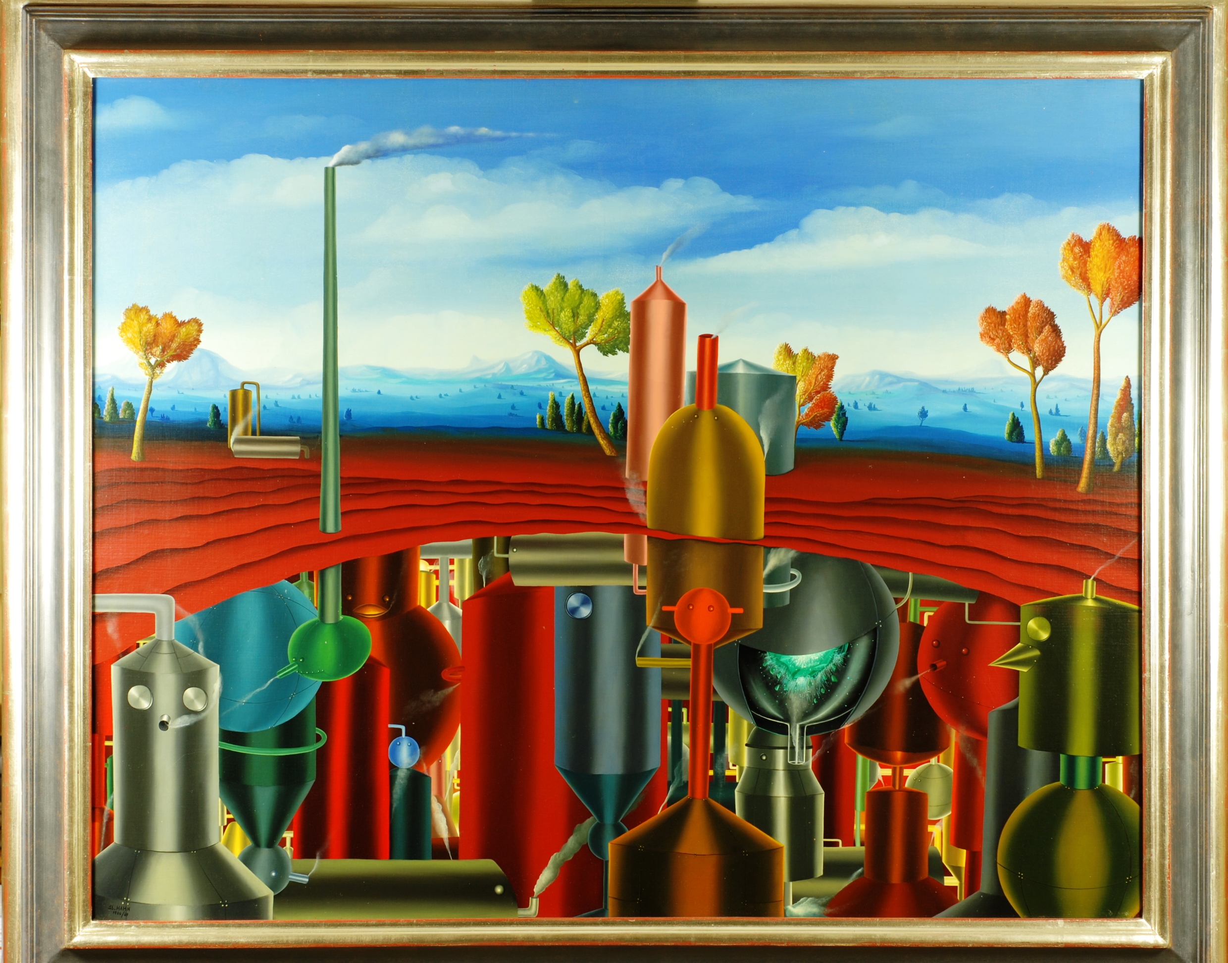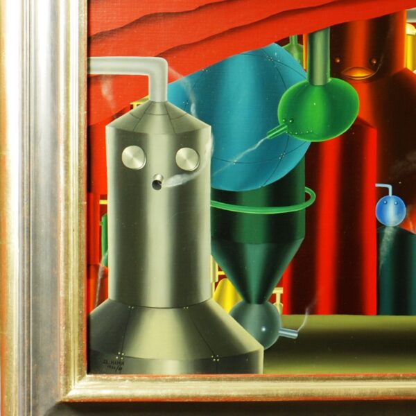 Au centre de la peinture se trouve un aperçu d’une grotte souterraine avec des bouilloires colorées, des récipients sous pression et des tuyaux. Sur certaines de ces bouilloires, les faces sont indiquées par des vis, des rivets ou des tuyaux, dont certains fument même. C’est évidemment une usine souterraine. Au-dessus du sol, il n’y a que quelques chaudières et une cheminée fumante au milieu d’un paysage rougeâtre aux arbres décolorés: prémonition de la destruction de l’environnement? La peinture à l’huile a un cadre de modèle sur mesure et est datée et signée sur le devant et le dos.