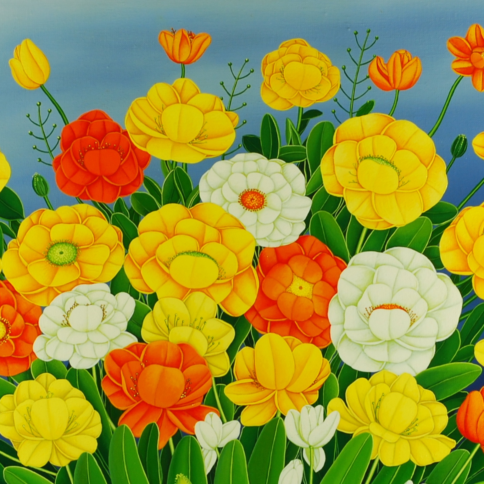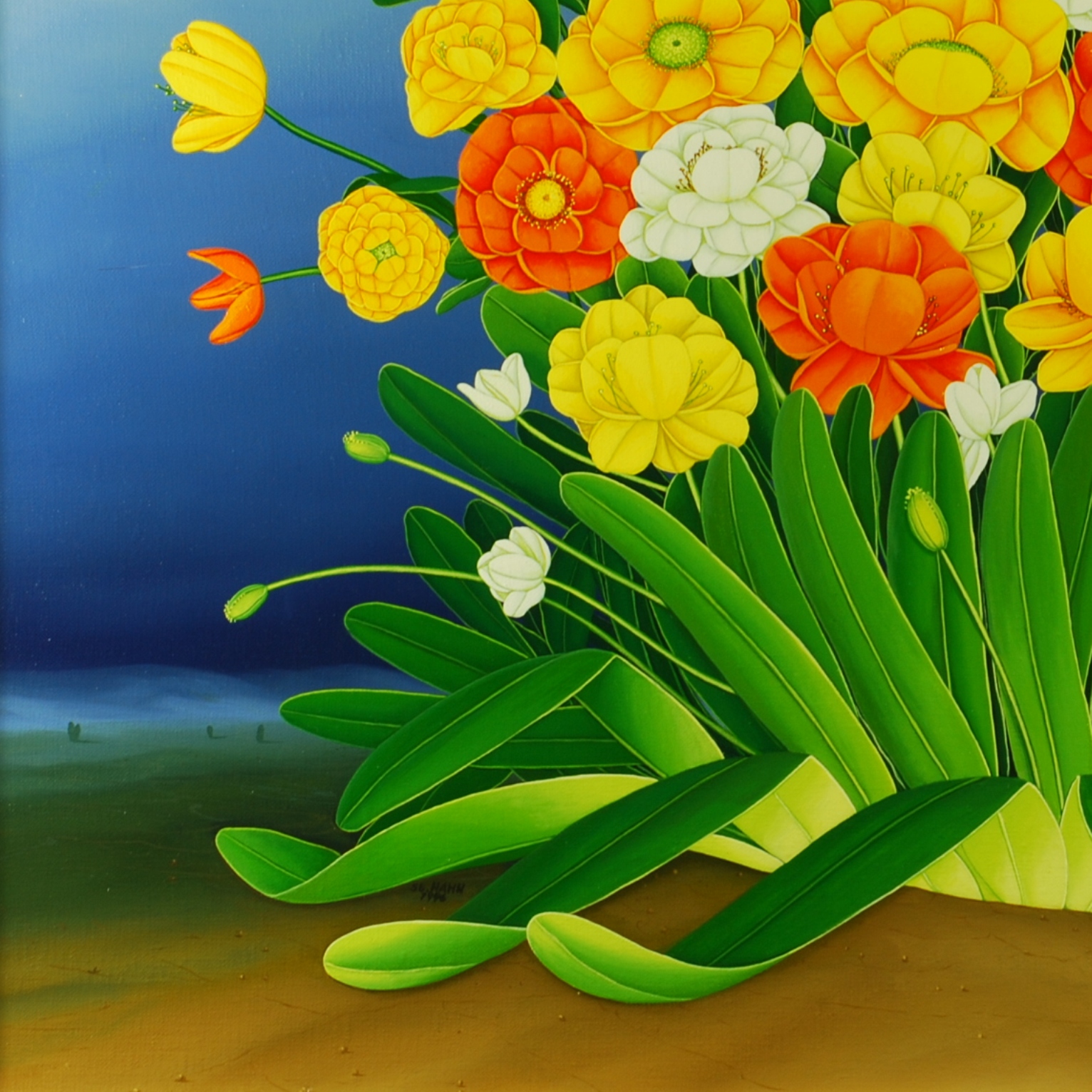 Un bouquet coloré de fleurs est au centre de la peinture à l’huile. Les fleurs à prédominance jaune sont relâchées par des fleurs isolées rouges et blanches. La division de l’image et le ciel bleu foncé soulignent la dominance du bouquet. La peinture a un cadre de modèle sur mesure et est datée et signée sur le devant.