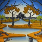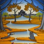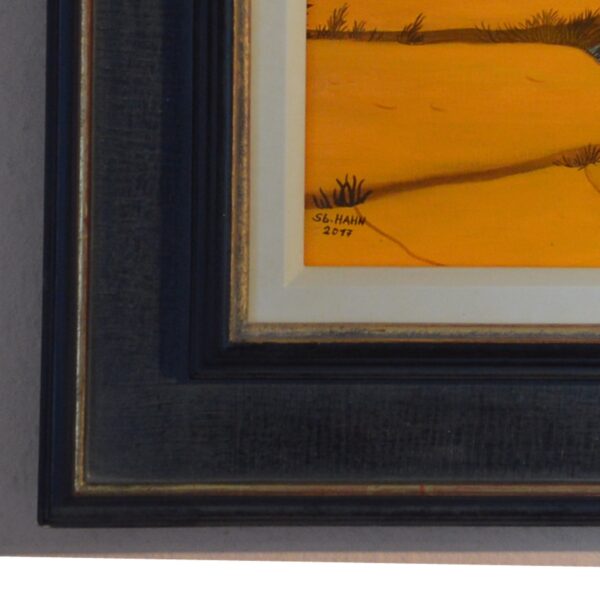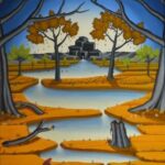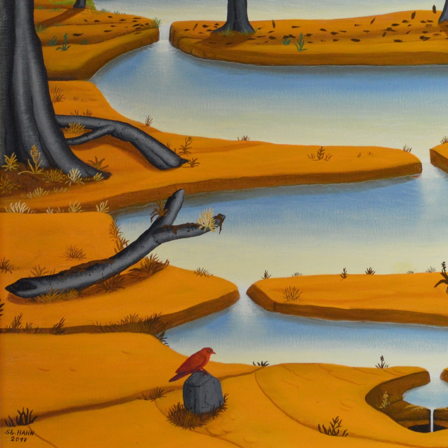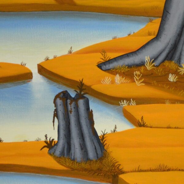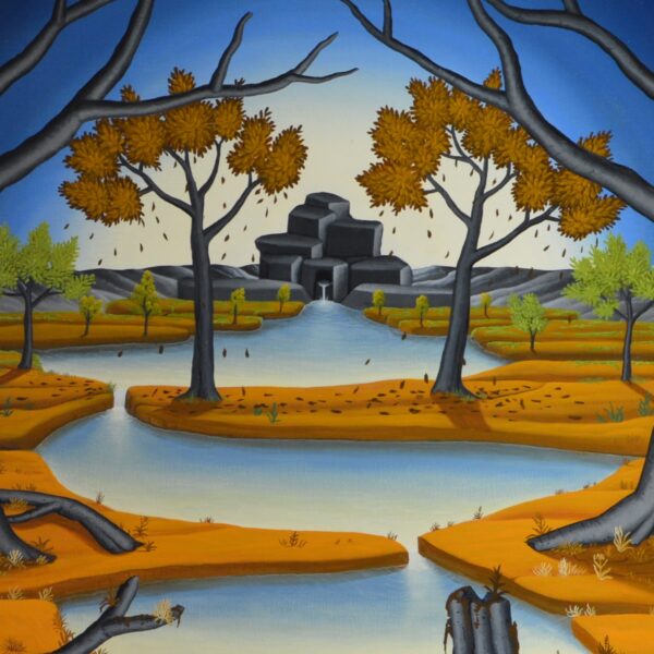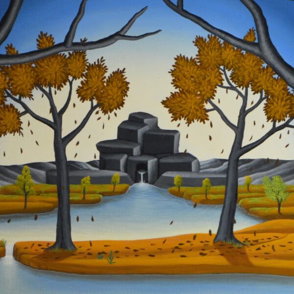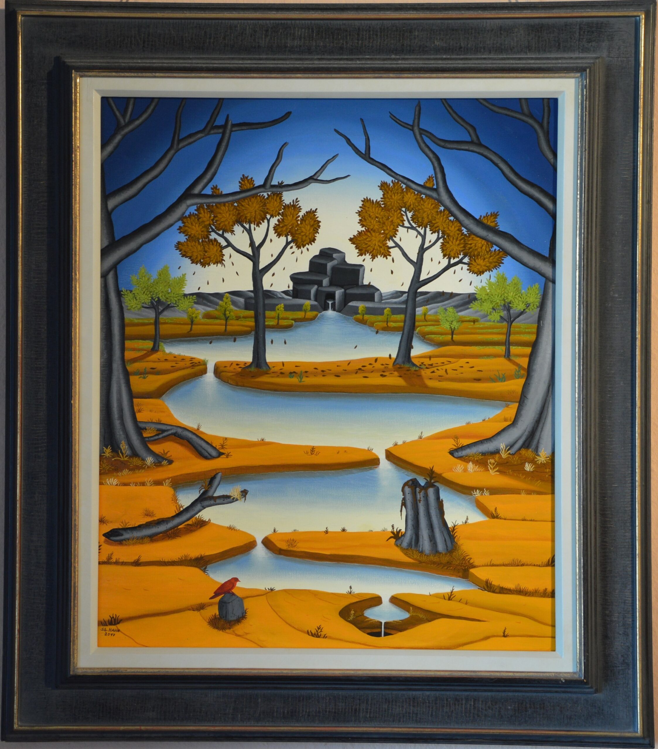 En arrière-plan de l’image, une rivière s’élève d’une source rocheuse. Cette rivière serpente à travers un paysage à l’avant de l’image. Là, l’eau s’écoule dans un trou dans le sol et finit par disparaître. Les arbres qui bordent la rivière changent la couleur de leur feuillage selon les saisons du printemps à l’été et de l’automne à l’hiver. Un petit oiseau est étonné au premier plan de la photo. La peinture a un cadre de modèle sur mesure et est datée et signée sur le devant et le dos.