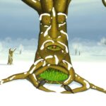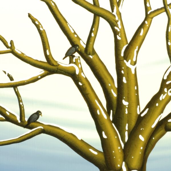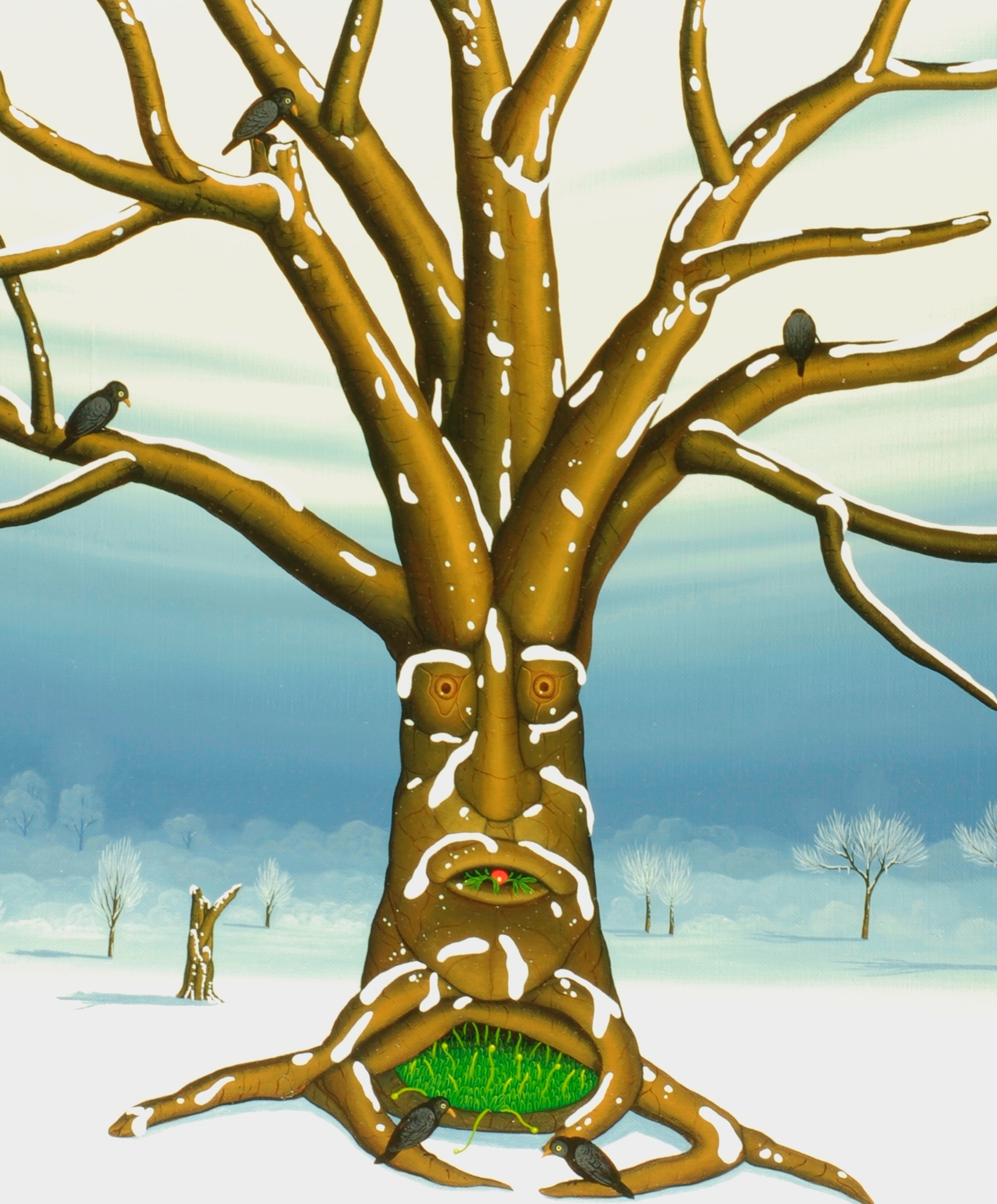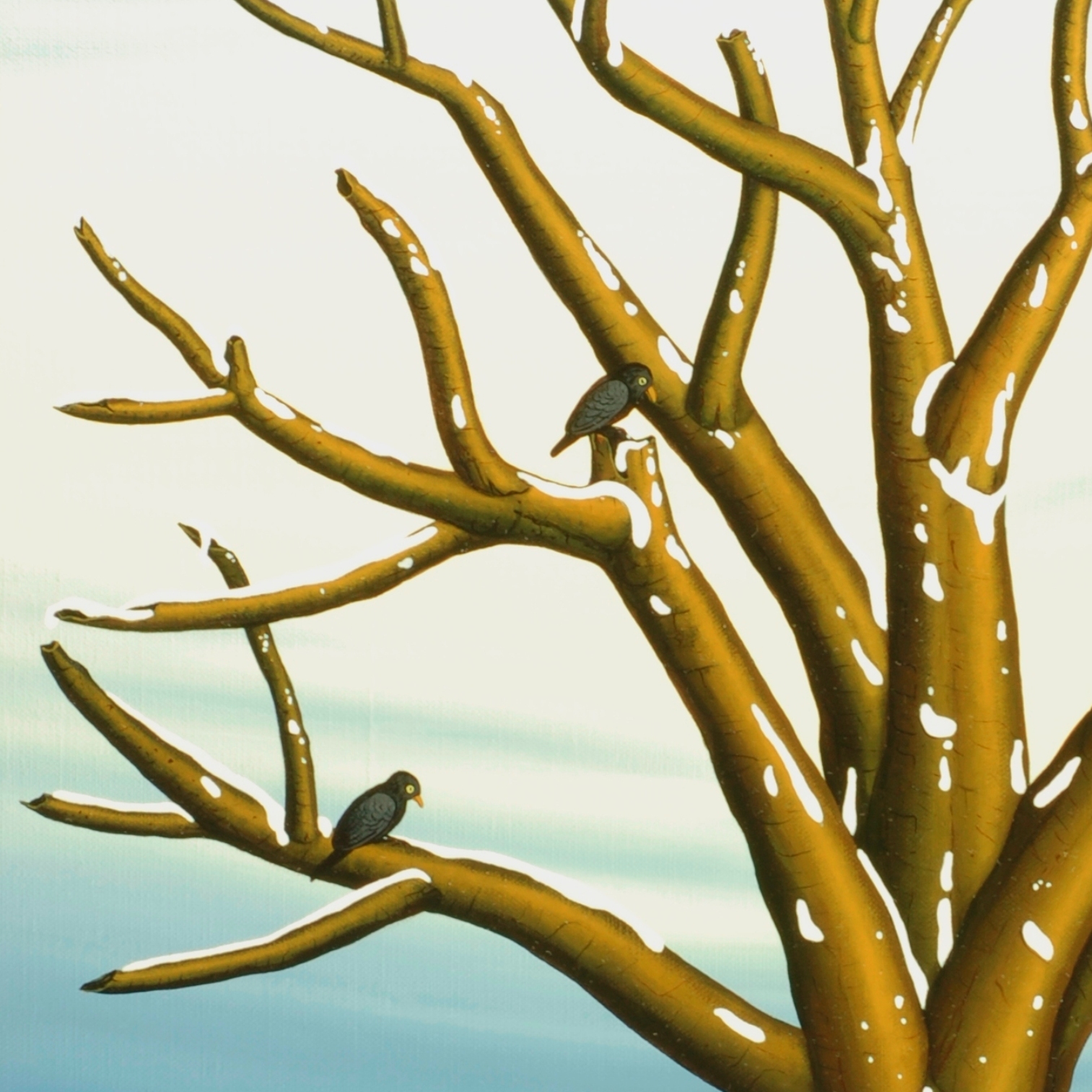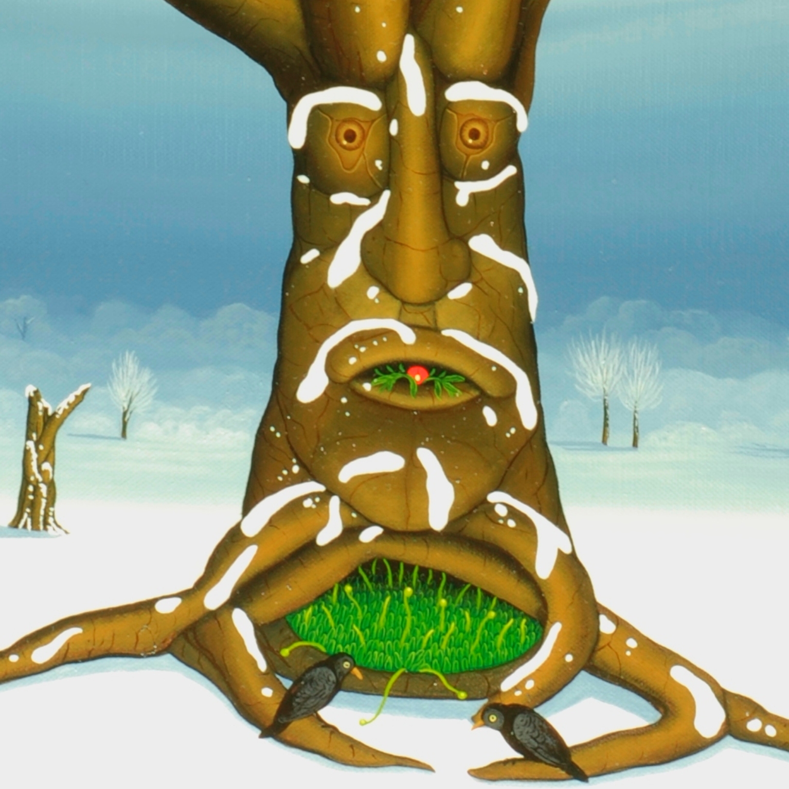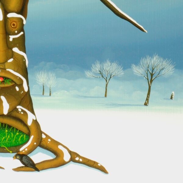 Au centre du paysage hivernal se trouve un arbre enneigé avec des oiseaux. Il y a un visage dans le tronc et de jeunes plantes vertes poussent dans une cavité racinaire malgré la saison froide. Cet arbre fier se dresse devant un paysage hivernal blanc-bleu avec d’autres petits arbres. Le paysage gelé donne à la cavité racinaire du tronc de l’arbre, devant laquelle deux oiseaux sont assis, une apparence encore plus vivifiante. Les deux oiseaux hésitent encore à s’approcher du visage. La peinture a un cadre de modèle sur mesure.