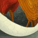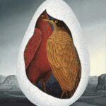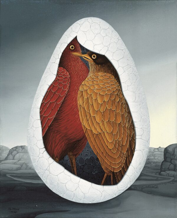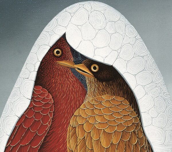 Le point central de la peinture est un œuf dans un paysage gris. Il y a deux oiseaux dans cet œuf. Dans l’œuf, symbole du développement de la vie, l’amour mûrit. Elle trouve la sécurité dans la protection de la coquille d’œuf. La particularité ici est que nous observons deux oiseaux à travers la coquille d’œuf cassée. Les oiseaux à bec symbolisent les humains et leurs partenaires. La peinture a un cadre de modèle sur mesure avec une application de feuille d’or.