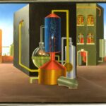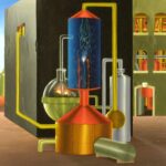 Au centre de l’image se trouve une distillation. En arrière-plan, il y a plusieurs bâtiments d’usine à travers les fenêtres desquels vous pouvez voir d’autres plantes. La distillation (chaudière, tubes, cuve de refroidissement, etc.) au centre de l’image est reliée au bâtiment arrière par un tuyau. La peinture a une représentation et un langage clairs. La peinture a un cadre de modèle sur mesure.