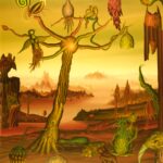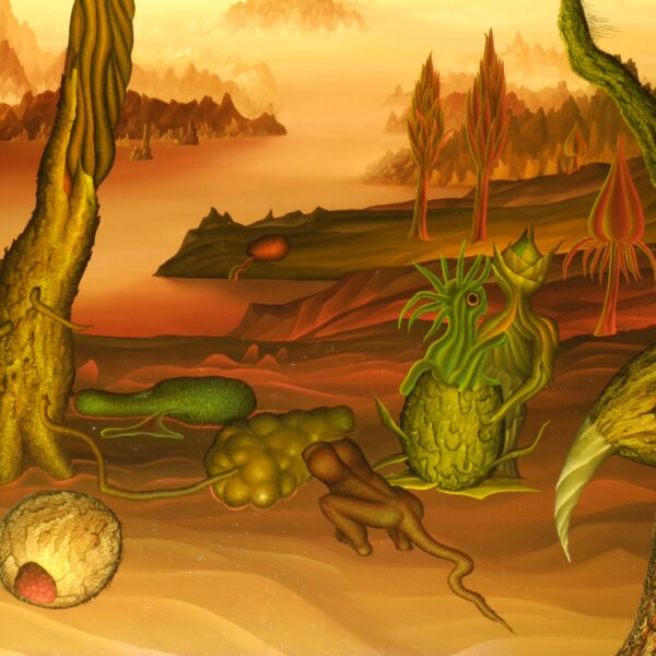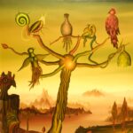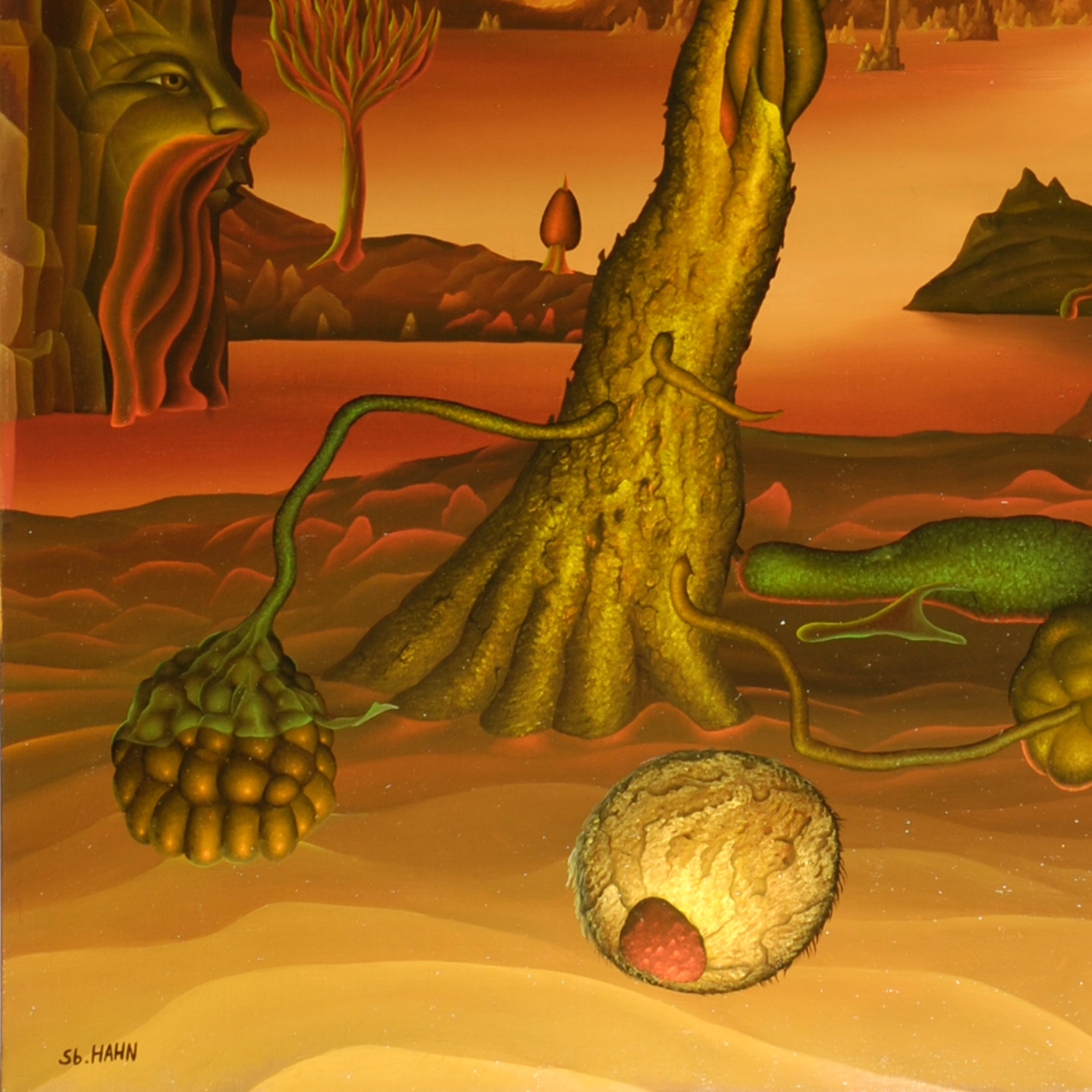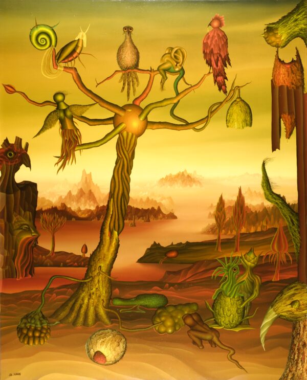 Au centre de la peinture à l’huile se trouve un arbre fantastique sur lequel sont assis plusieurs animaux ressemblant à des oiseaux. Le paysage paisiblement composé avec des montagnes, des rochers et un lac dans lequel l’arbre se dresse semble hors de ce monde. Le spectateur peut voir différents yeux dans la peinture dans les rochers et les plantes irréelles. La peinture a un cadre de modèle sur mesure et est signée sur le devant. De plus, le tableau est titré, daté et signé au dos.