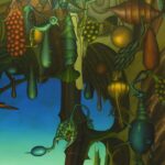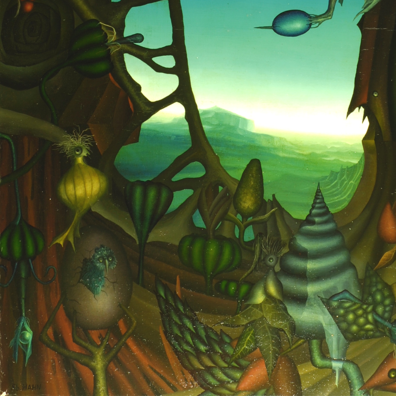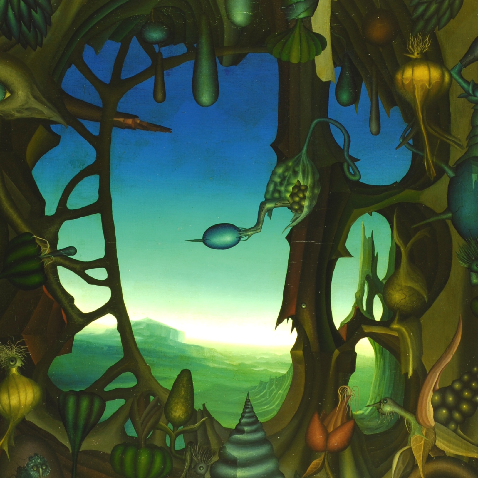 Au centre du tableau, le spectateur regarde hors d’une grotte dans un paysage étrange. Cependant, le spectateur découvre très rapidement les créatures mythiques et les fruits fantastiques qui pendent du plafond de la tombe. Les fruits poussent également sur le sol et divers êtres et personnages imaginatifs s’ébattent. Certains yeux regardent directement le spectateur. La peinture a un cadre de modèle sur mesure et est datée et signée sur le titre et le dos.