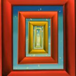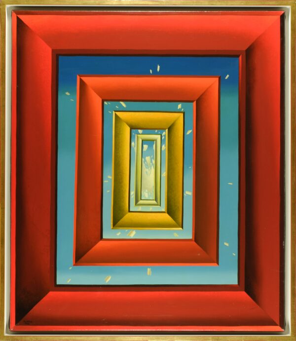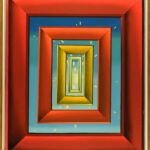 Au centre de l’image se trouve une image avec un cadre qui se répète plusieurs fois. La destruction de la peinture sur panneau est contredite par la représentation de la peinture sur panneau dans la peinture sur panneau. Le panneau est mort, vive le panneau. Le fond bleu clair combine les images individuelles en une seule image. La peinture a un cadre de modèle sur mesure.
