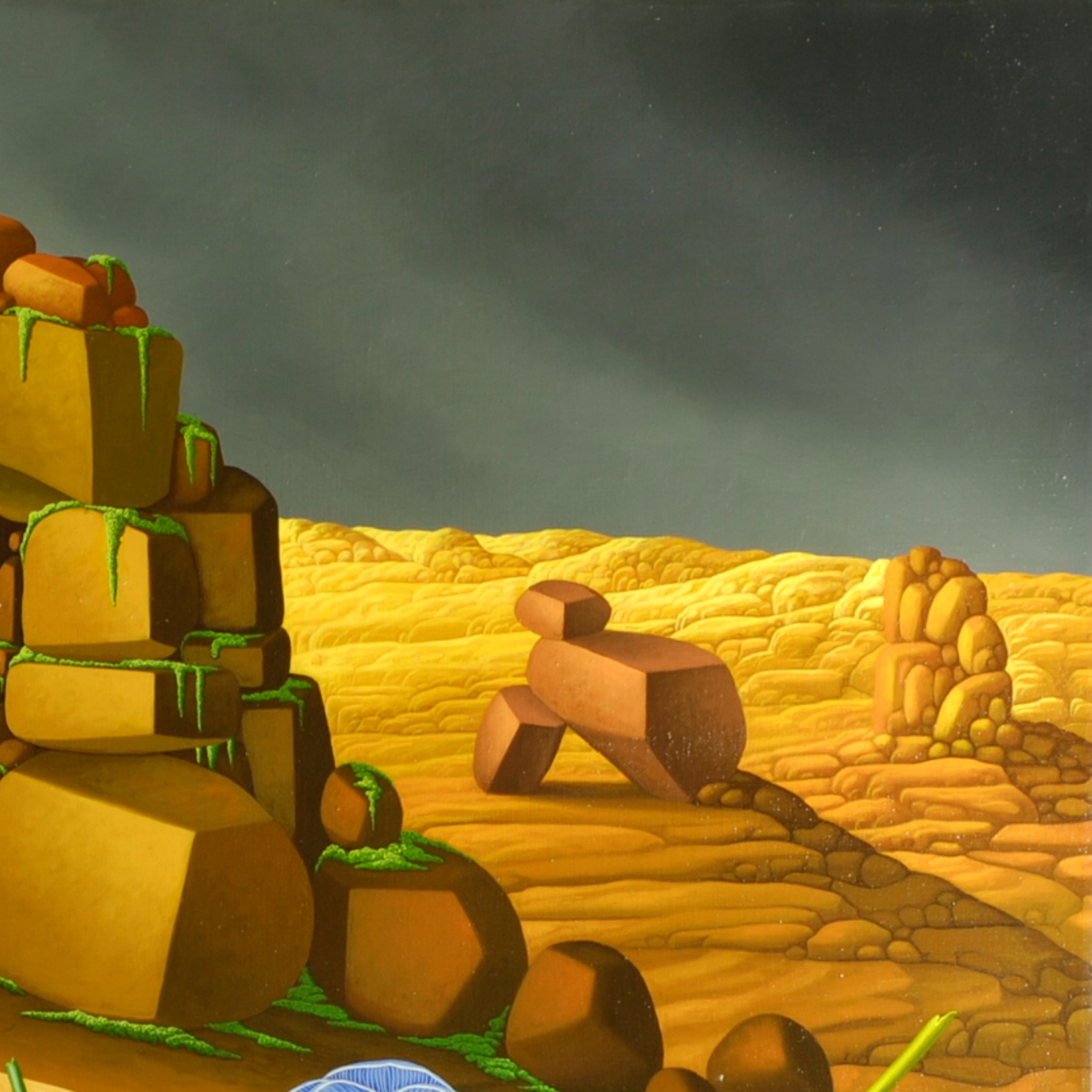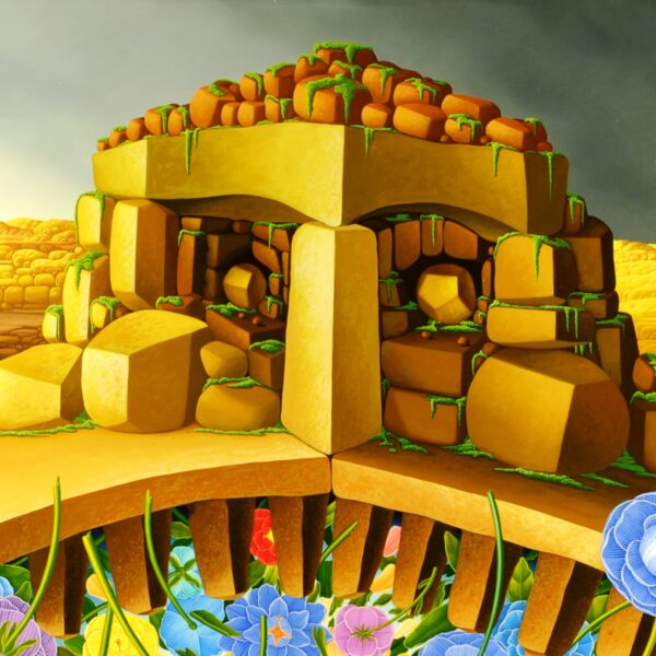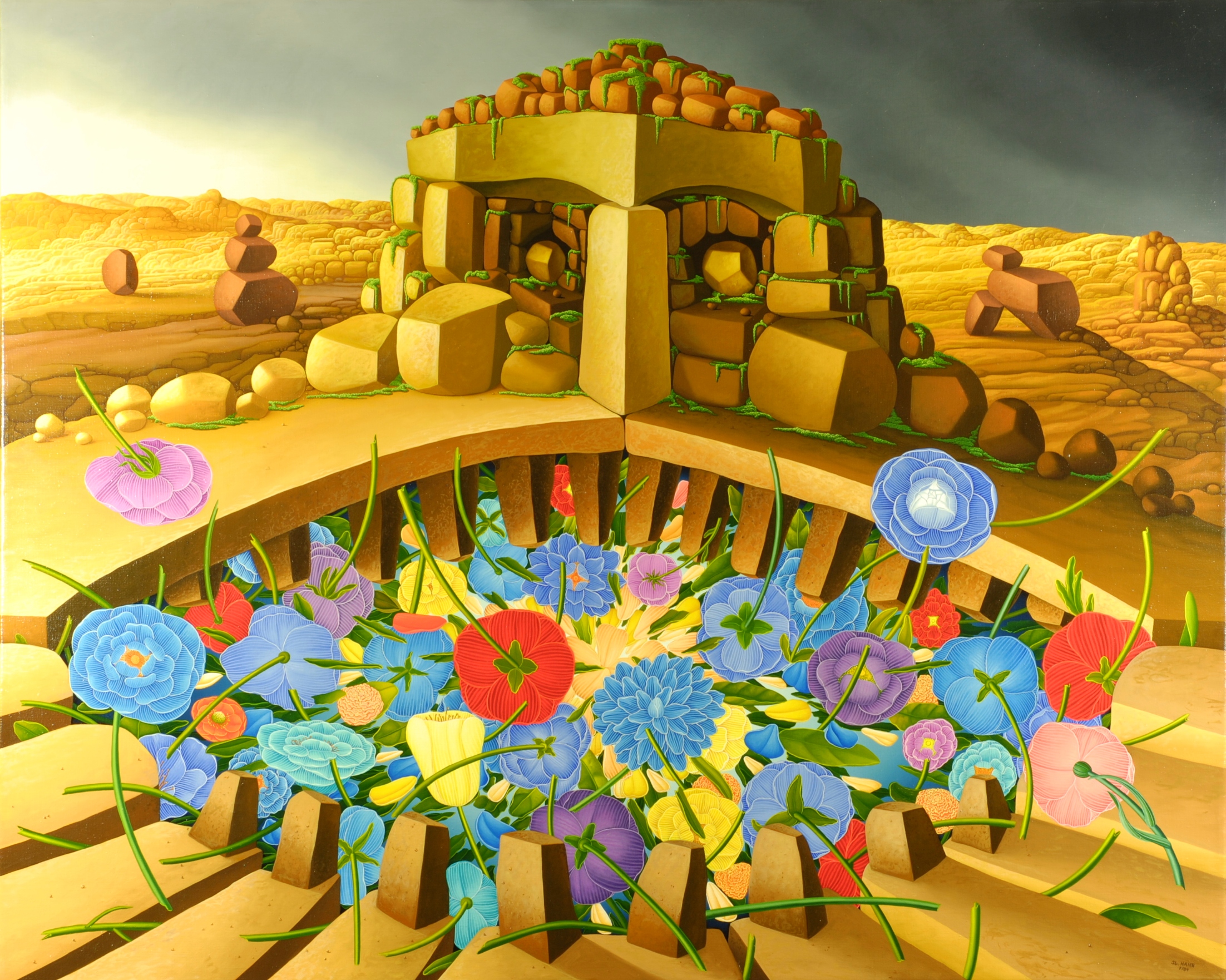La peinture à l’huile est caractérisée par une énorme bouche en pierre. Des rochers, des quarders et des dalles forment un visage avec une immense bouche aux dents impressionnantes. La bouche de pierre semble avaler toutes les fleurs environnantes. La peinture à l’huile a un cadre de modèle sur mesure et est datée et signée sur le devant.