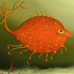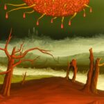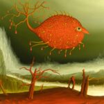 Au centre de l’image, un poisson rouge plane au-dessus d’un paysage surréaliste. La beauté du poisson rubis est soulignée par les arbres en ruine et les rochers flous. L’œil humain et le nez pointu du poisson rubis ne rappellent pas nécessairement un poisson. La peinture a un cadre de modèle sur mesure.