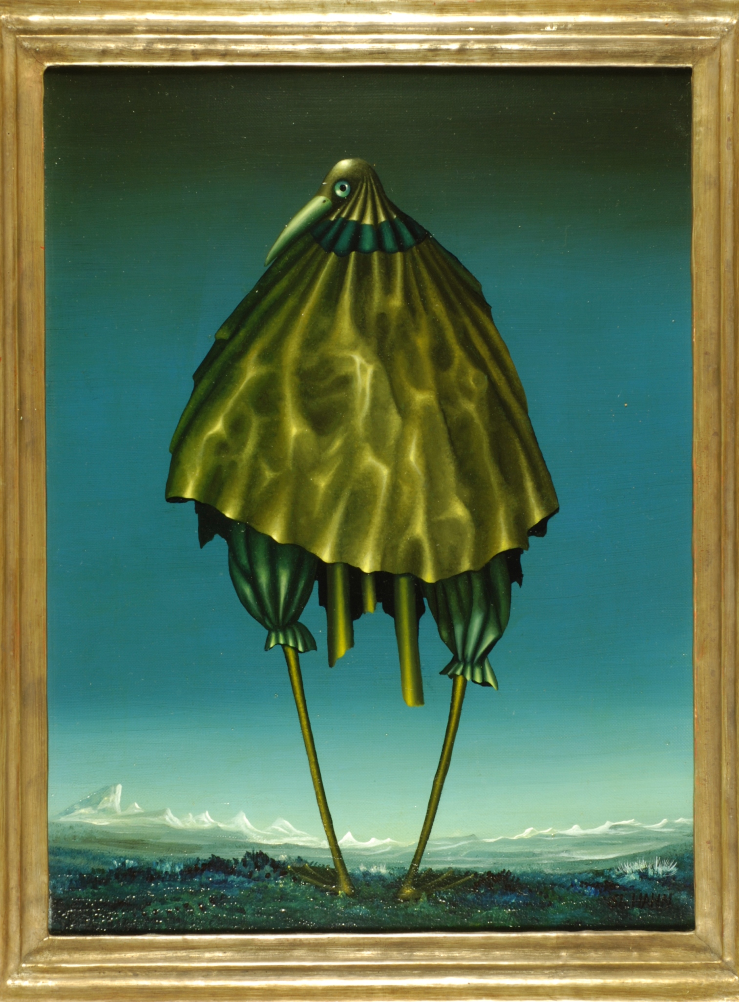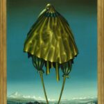Un oiseau surréaliste à l’aspect métallique est au centre de cette peinture. Les rochers blancs en arrière-plan et le ciel nocturne dominant forment le cadre de l’oiseau sur pilotis. L’oiseau sur pilotis regarde en arrière et regarde le spectateur. Le plumage métallique ressemble à une cape et les rayons du soleil se brisent sur les bords de l’oiseau sur pilotis. La peinture a un cadre de modèle sur mesure.
