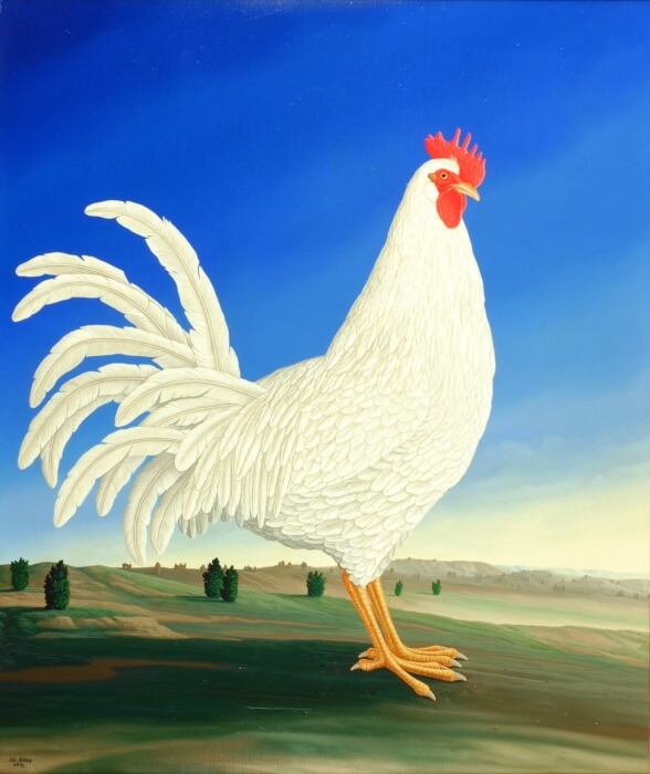 Un oiseau dans la nuit garde son œuf avec un poussin qui vient d’éclore. De l’œuf dont la coquille est cassée, un œil regarde dans la nuit grise et sombre. Le ciel nocturne bleu acier et le paysage aride laissent briller le plumage gris de l’oiseau nocturne. Le magnifique oiseau de nuit attend l’éclosion de la progéniture. La peinture a un cadre de modèle sur mesure.
