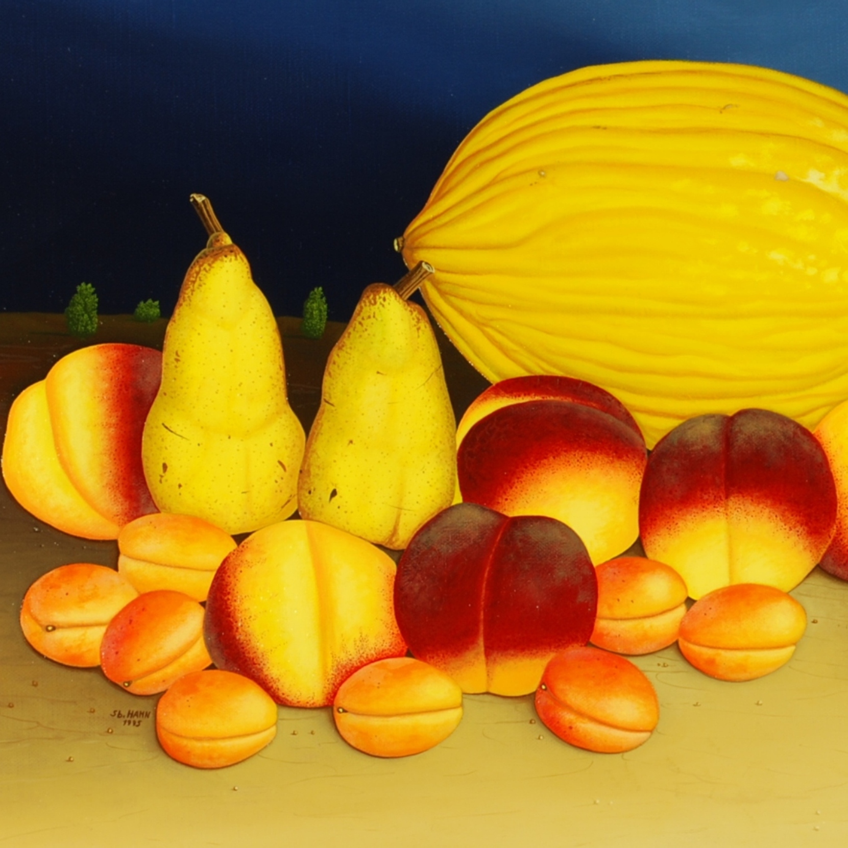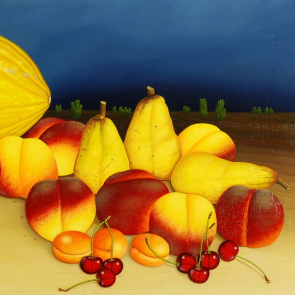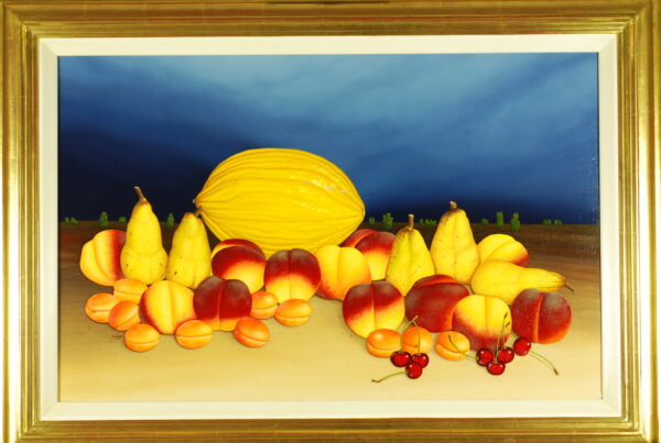 La nature morte au melon est une composition d’un melon miel jaune avec cinq poires mûres et sept cerises ainsi que onze abricots et douze nectarines. Le fruit, qui se trouve devant un ciel nocturne bleu foncé, brille sur un sol couleur sable. Le fruit de la nature morte a été peint dans sa taille d’origine, ce qui lui donne un aspect particulièrement réaliste. La peinture à l’huile a un cadre modèle sur mesure avec un passe-partout. L’ensemble du cadre en bois a ensuite été recouvert de feuille d’or. Le tableau est daté et signé sur le devant. Le tableau est titré, daté et signé au revers. Le tableau avec le cadre a les dimensions suivantes: 67 x 92 cm (hauteur x largeur).