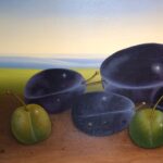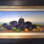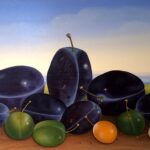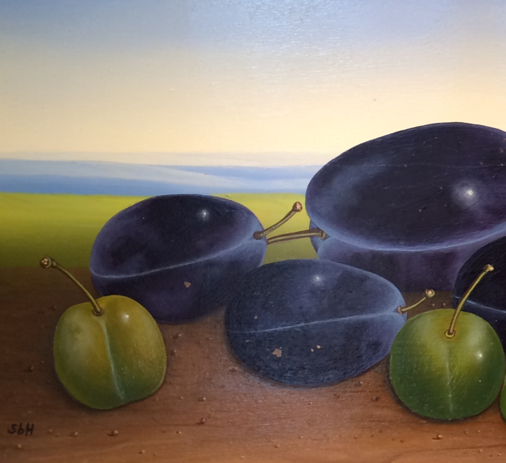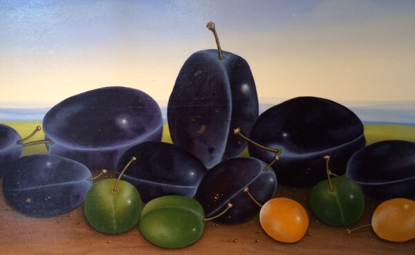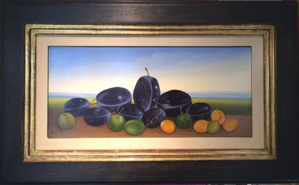 Différents types de fruits sont au centre de la nature morte. Trois prunes, quatre mirabelles, cinq pures griffes et cinq prunes sont présentées dans leur taille d’origine devant un paysage avec un ciel bleu. En raison de la représentation des fruits dans leur taille d’origine, la peinture à l’huile semble très réaliste pour le spectateur. La peinture a un cadre de modèle sur mesure.