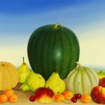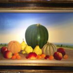 La nature morte se concentre sur divers melons et fruits (un total de deux melons, sept abricots, trois cerises, cinq pêches et trois poires) devant un paysage paisible. L’image est dominée par les pastèques vertes centrales. Les autres melons et fruits sont devant la pastèque verte. La peinture a un cadre de modèle sur mesure.