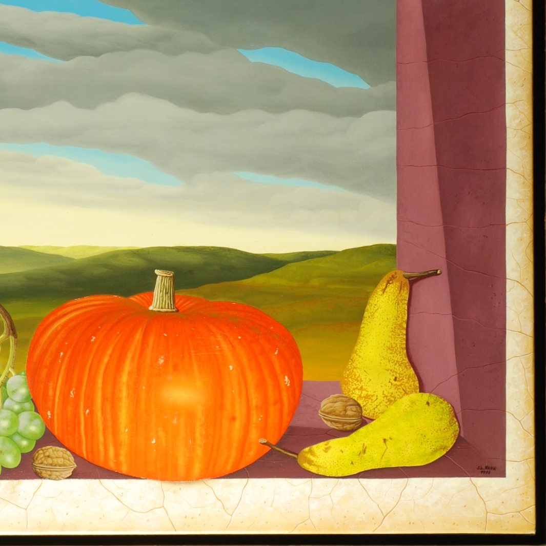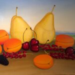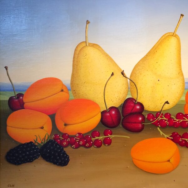 La nature morte aux fruits se compose de poires, cerises, abricots, mûres et groseilles. Le fruit se trouve dans un paysage d’été. Les fruits ont été peints dans leur taille d’origine et semblent donc réalistes – à portée de main. La peinture à l’huile a un cadre de modèle sur mesure et est signée sur le devant et titrée, datée et signée au dos.