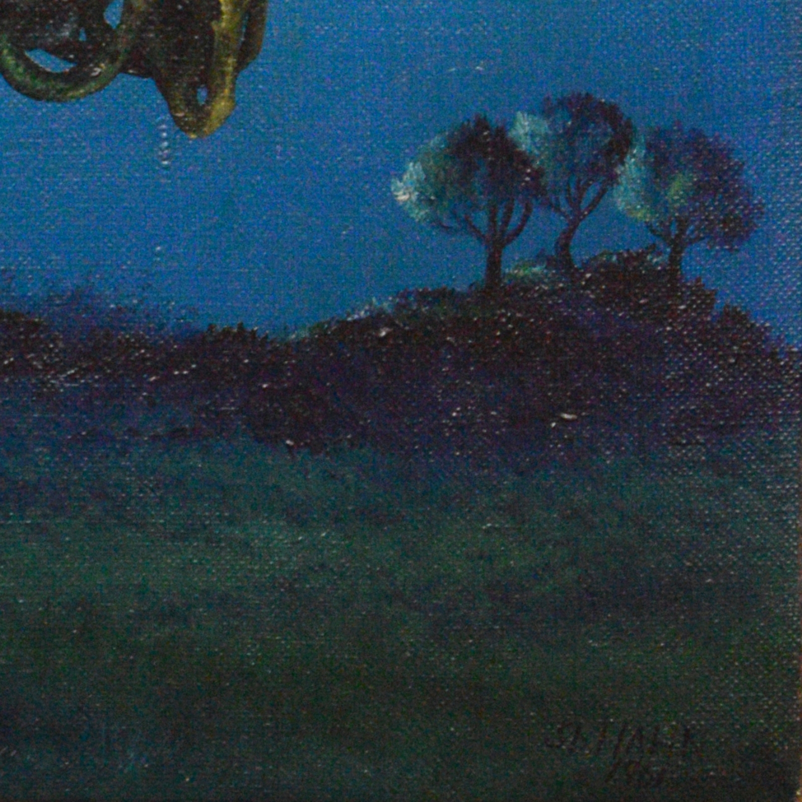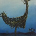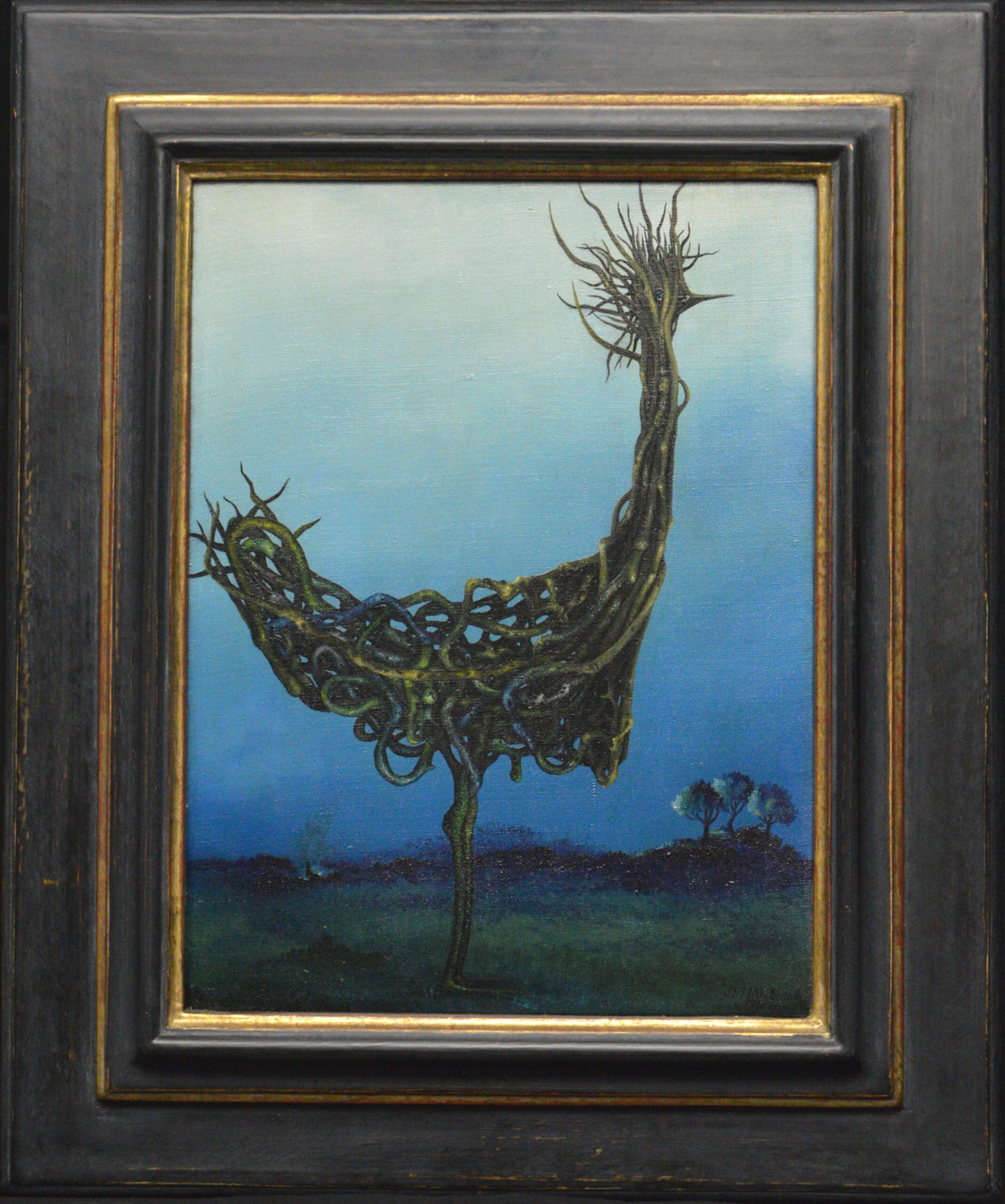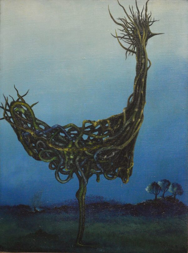 Un grand oiseau se dresse au centre du tableau. Au lieu de la robe de campagne classique, cet oiseau est composé de nombreuses racines entrelacées. Même la tête de l’oiseau est entièrement constituée de racines dans lesquelles le spectateur peut également découvrir un œil. L’oiseau racine se présente devant un paysage sombre avec quelques arbres à l’ombre. La peinture a un cadre de modèle sur mesure et est datée et signée sur le titre et le dos.