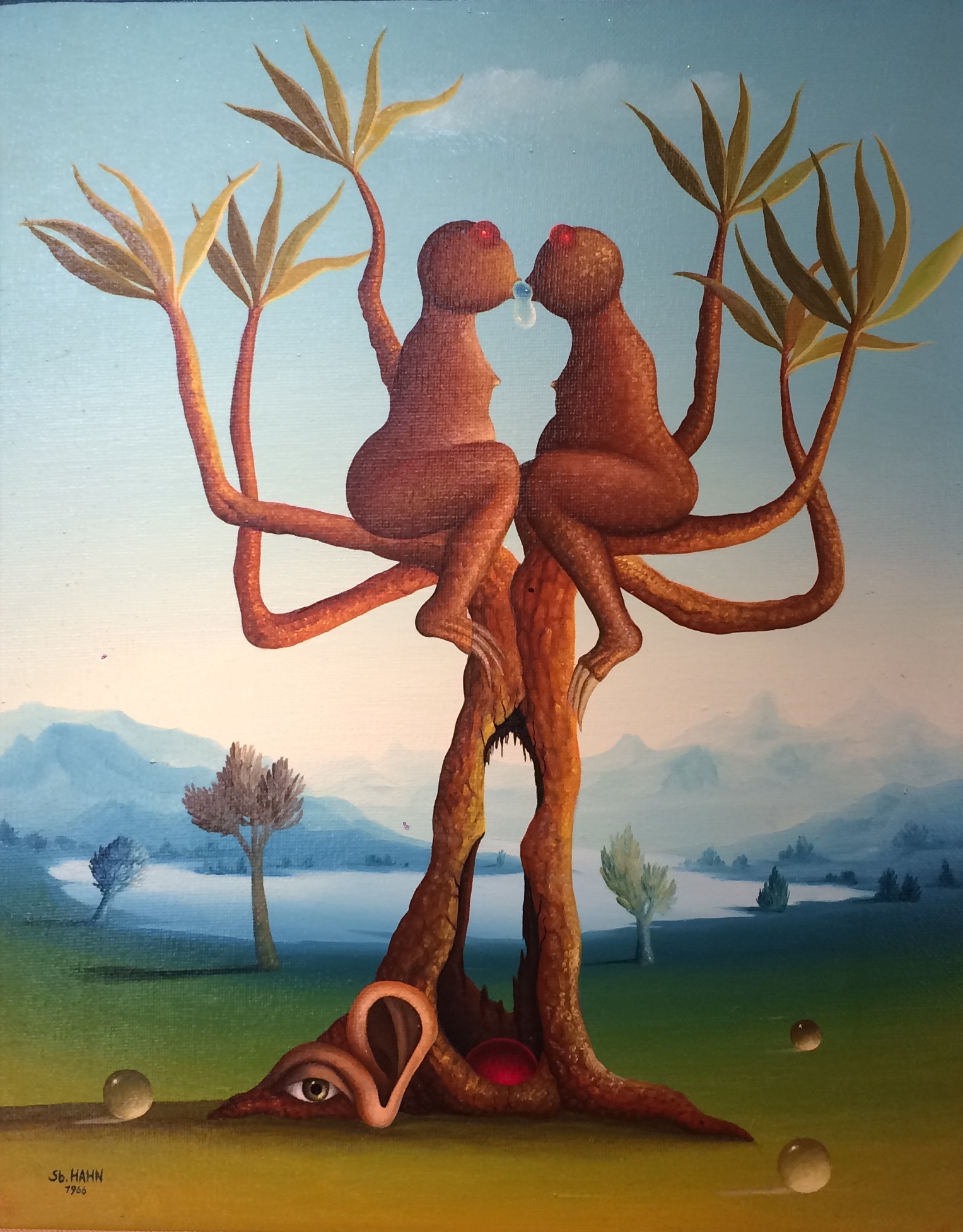 Le tableau décrit le désir au début. Un symbole typique du début est l’œuf, qui est au centre de la peinture à l’huile. Des branches d’arbres, des fleurs, des buissons et des oiseaux sortent de cet œuf. Le paysage convivial avec des espaces verts éclatants est évidemment préparé aux cadeaux de la glace. Le tableau présente un cadre modèle sur mesure avec des appliqués en or blanc. Le tableau est titré, daté et signé au dos.