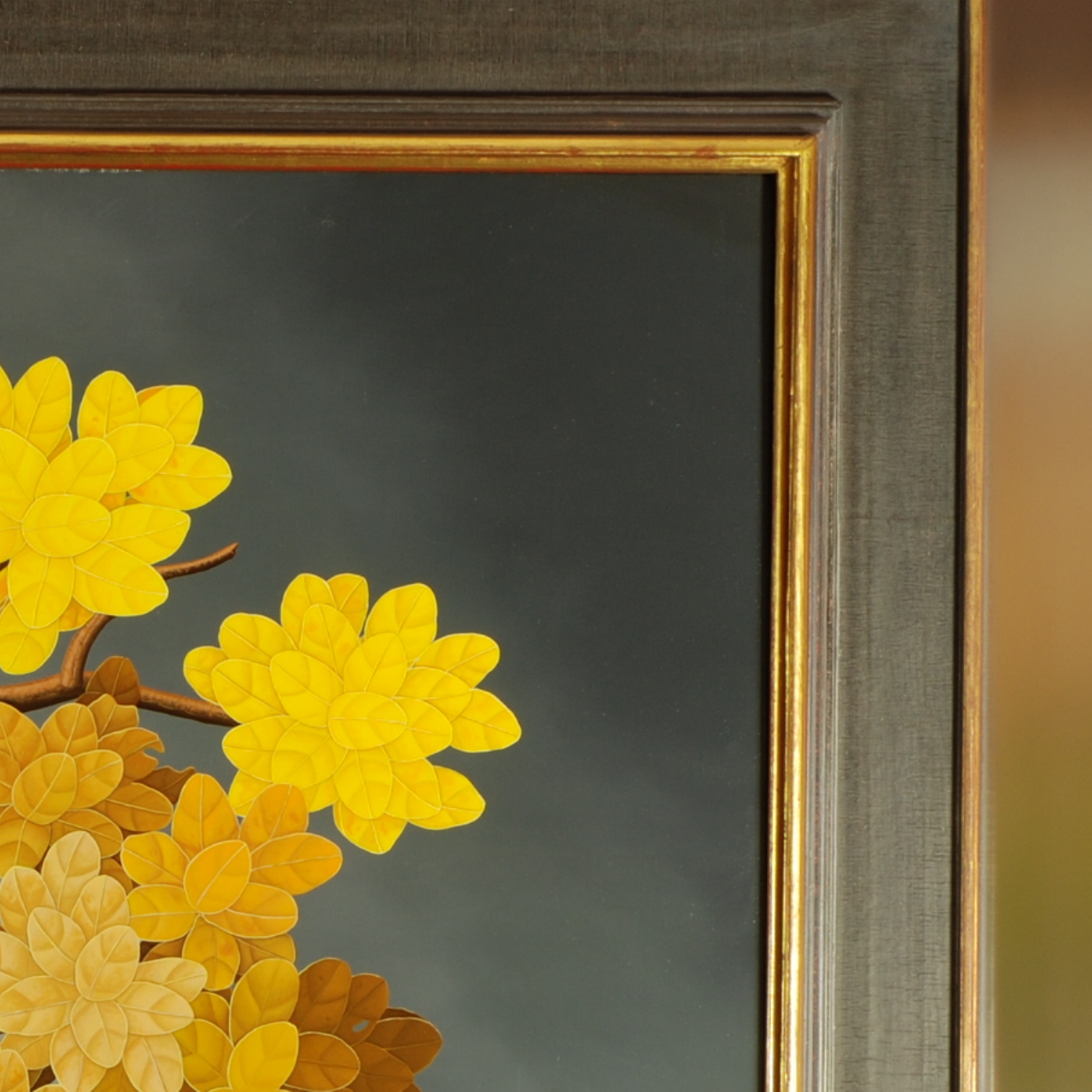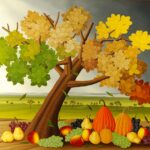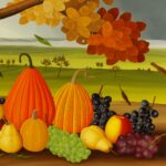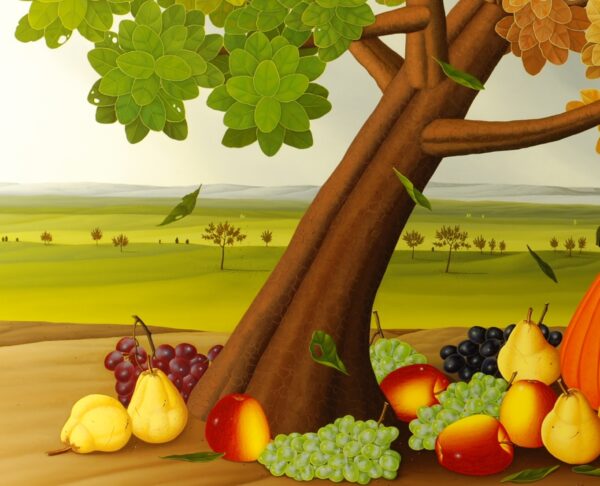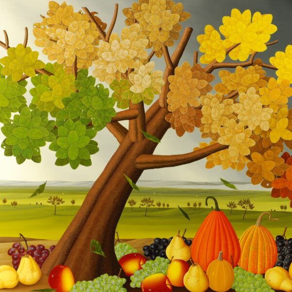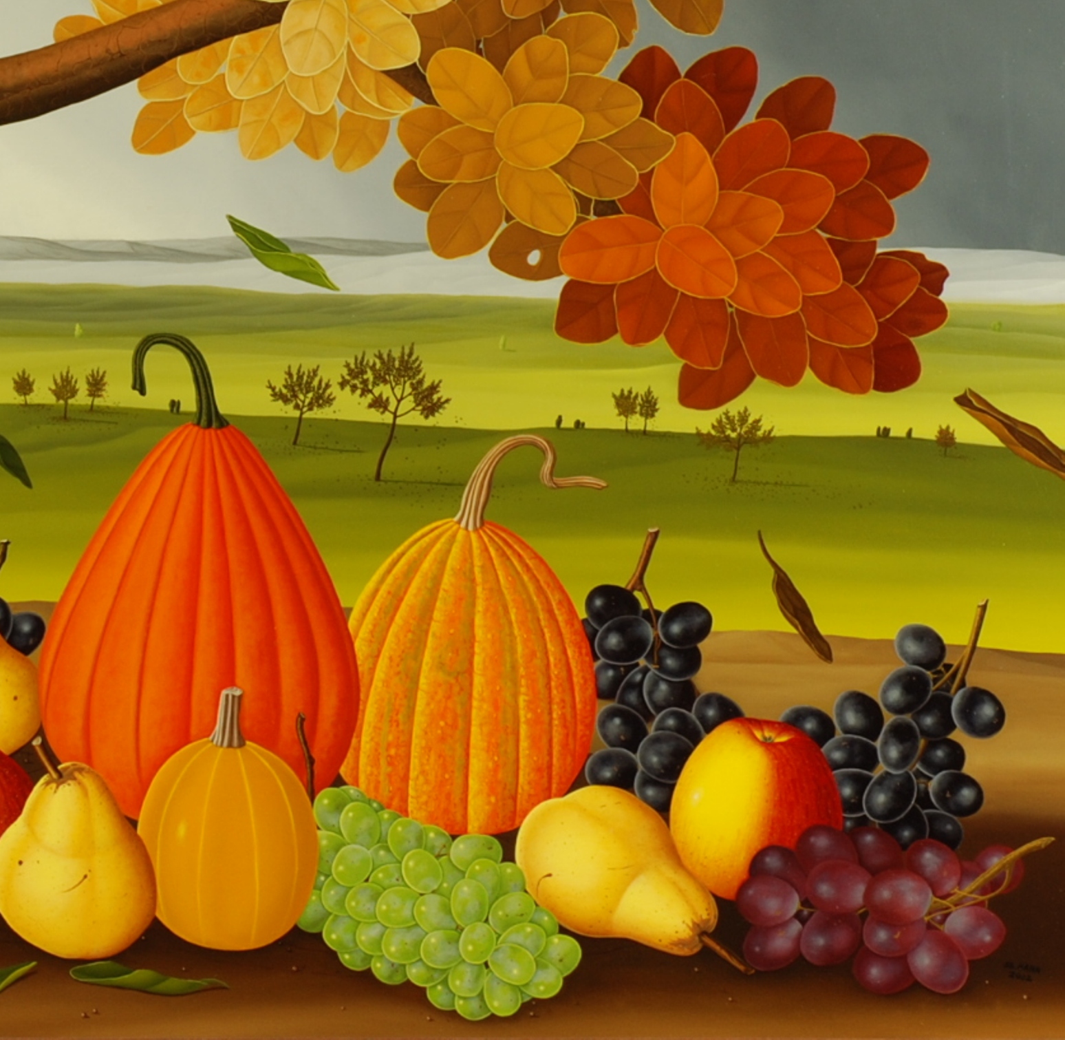 Au centre de la peinture à l’huile se trouve un magnifique arbre aux feuilles d’automne colorées. Il y a de nombreux fruits sous l’arbre, tels que les raisins, les pommes, les poires et les petites et grandes citrouilles. L’arbre d’automne avec les types de fruits et légumes drapés – comme une nature morte – a été peint devant un paysage d’automne accueillant. Les fruits ont tous été peints dans leur taille d’origine et ont donc l’air si réalistes. La peinture a un cadre de modèle sur mesure et est signée et datée sur le devant. Le tableau est titré, signé et daté au dos.