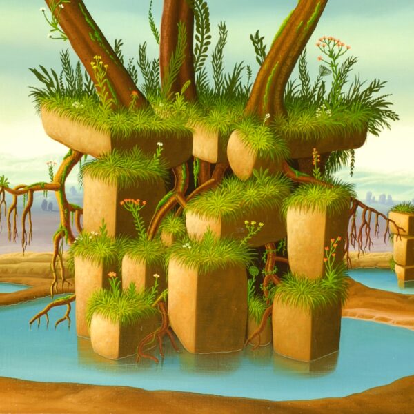 Au centre de la peinture à l’huile se trouvent trois arbres magnifiques sur une île rocheuse. Plusieurs oiseaux attendent dans les trois arbres à feuilles caduques. Le lichen, les fougères et les petites fleurs poussent sur les rochers. En arrière-plan du tableau, vous pouvez voir de petits buissons et des lacs. La peinture à l’huile a un cadre de modèle sur mesure. La photo est datée et signée au recto et titrée, datée et signée au dos.
