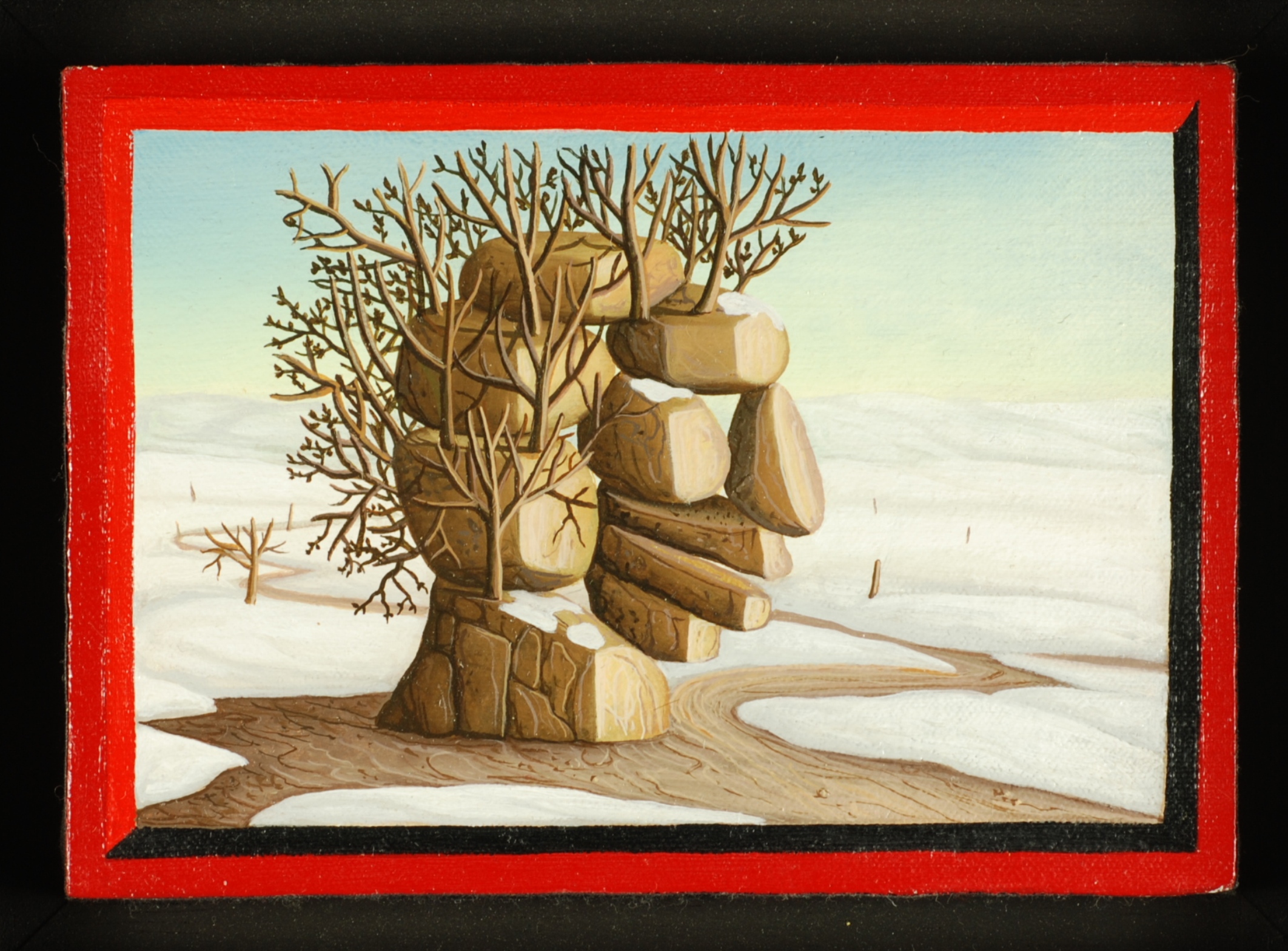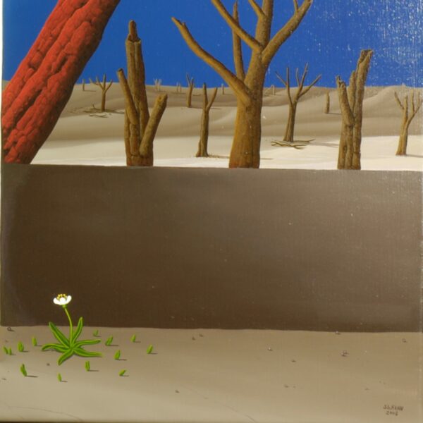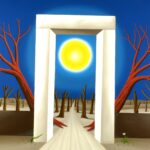 Im Mittelpunkt des Bildes steht ein weisses Tor, durch das eine grosse gelbe Sonne strahlt. Wenn man durch das Tor schaut, sieht man eine Landschaft voller abgestorbener Bäume. Auf einem Baum sitzt ein eingeschüchterter Vogel. Ein langer Weg durch die toten Bäume führt direkt auf das weisse Tor zu. Weiss gilt hier als Farbe der Unschuld und Reinheit. Das Ölgemälde hat einen einzelgefertigten Modellrahmen und ist auf der Vorderseite datiert und signiert.