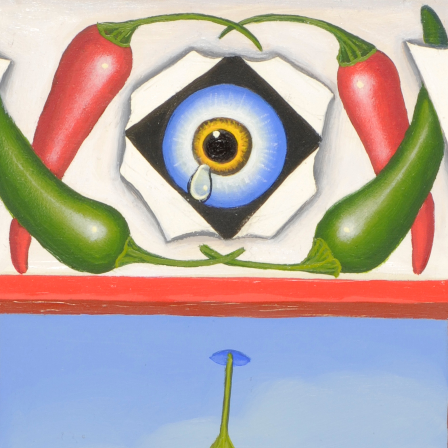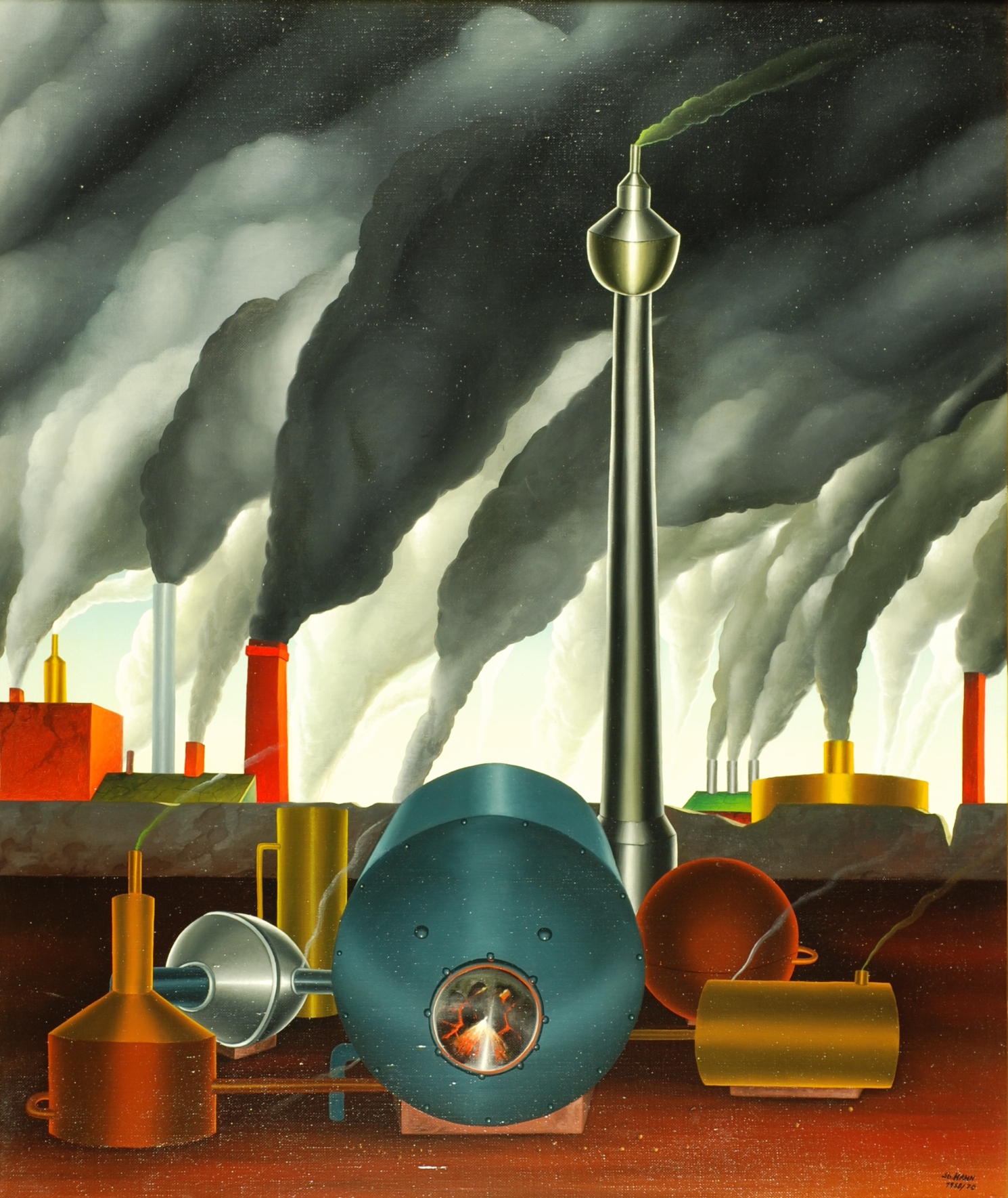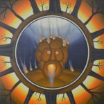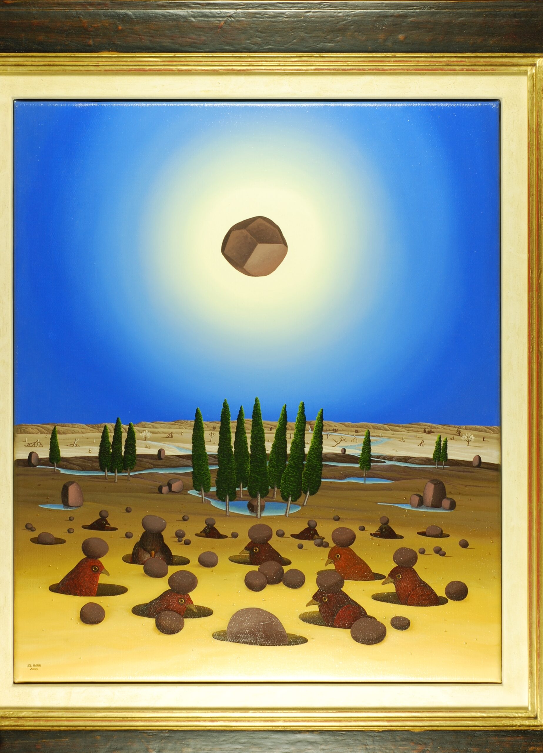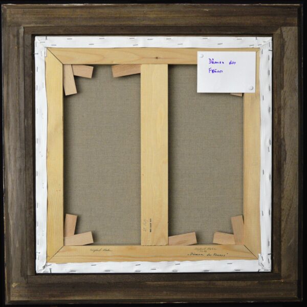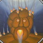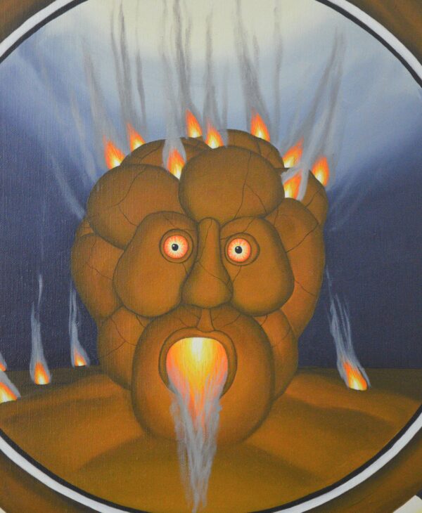 Im Mittelpunkt des klassischen Tondo befindet sich ein feuerspeiendes Gesicht. Der Kopf ist geformt aus mehreren Steinbrocken. Dort, wo man Haare vermutet, lodern zahlreiche kleine Feuer auf. Gesäumt wird das Tondo von verbrannten Bäumen. Der Himmel erstrahlt in glühenden Farben, von weiß über gelb bis dunkelorange. Das Gemälde verfügt über einen einzelgefertigten Modellrahmen und hat ein Passepartout. Der Künstler hat das Ölgemälde auf der Rückseite betitelt, datiert und signiert.