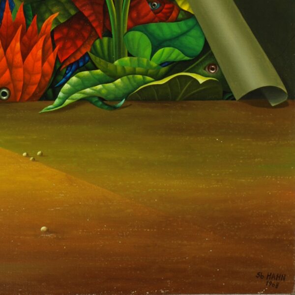 In einer kargen Gegend steht ein Haus in Form eines Betonkubus. Die Fassade des Hauses reisst gerade auf und offenbart eingesperrte farbenfrohe Pflanzen und Fabelwesen. Teilweise erobern sich die Pflanzen den kargen Raum zurück. Das Gemälde ist ein Sinnbild für die eingeengte und zurückgedrängte Natur, die sich nun langsam ihren Lebensraum zurückerobert. Das Gemälde verfügt über einen einzelgefertigten Modellrahmen und ist auf der Vorder- und Rückseite datiert und signiert.