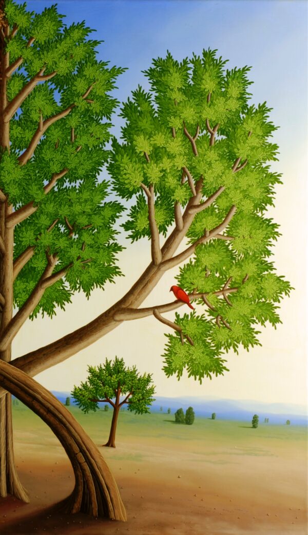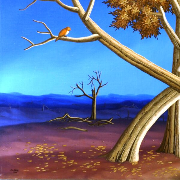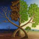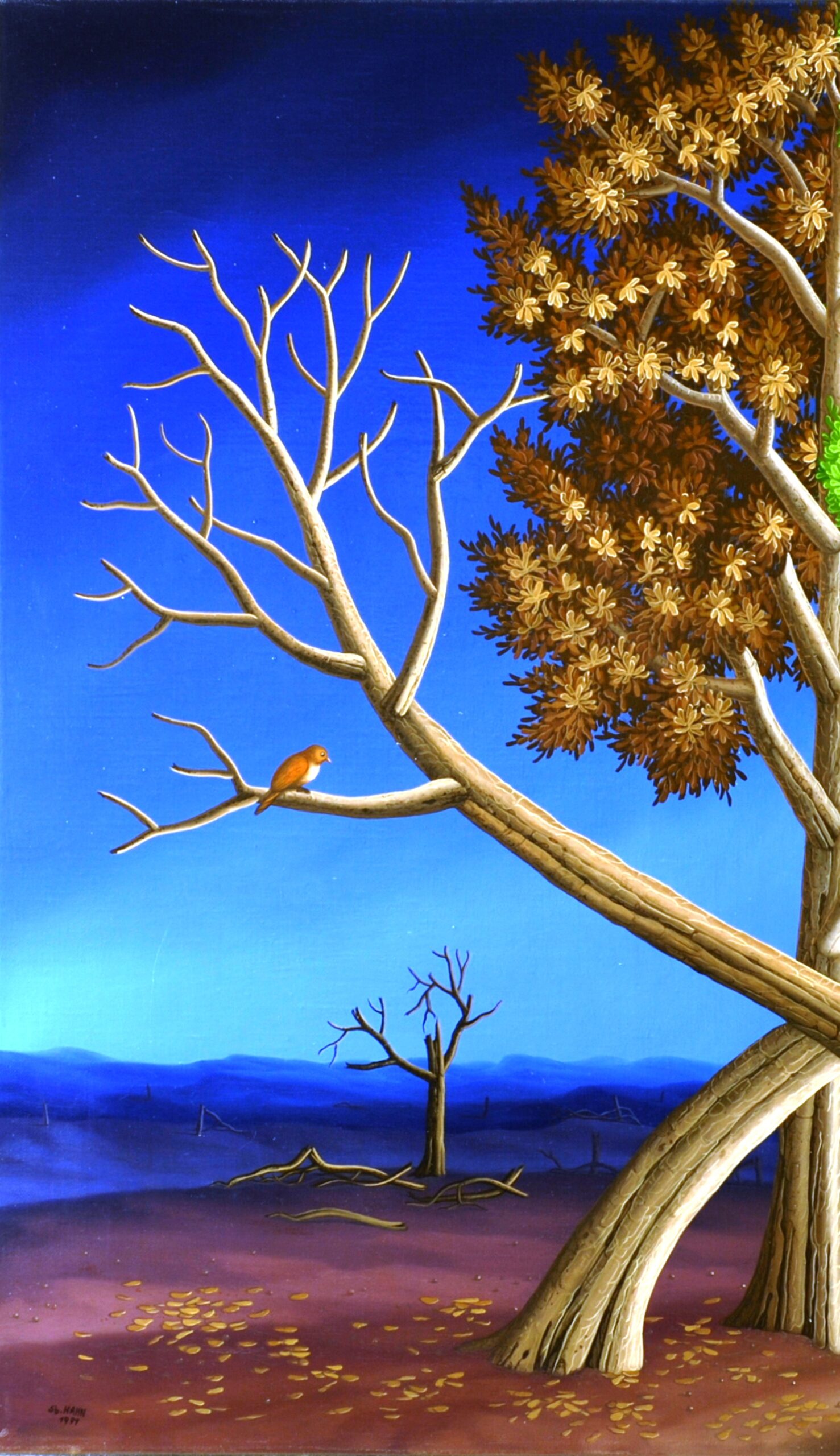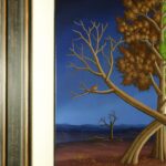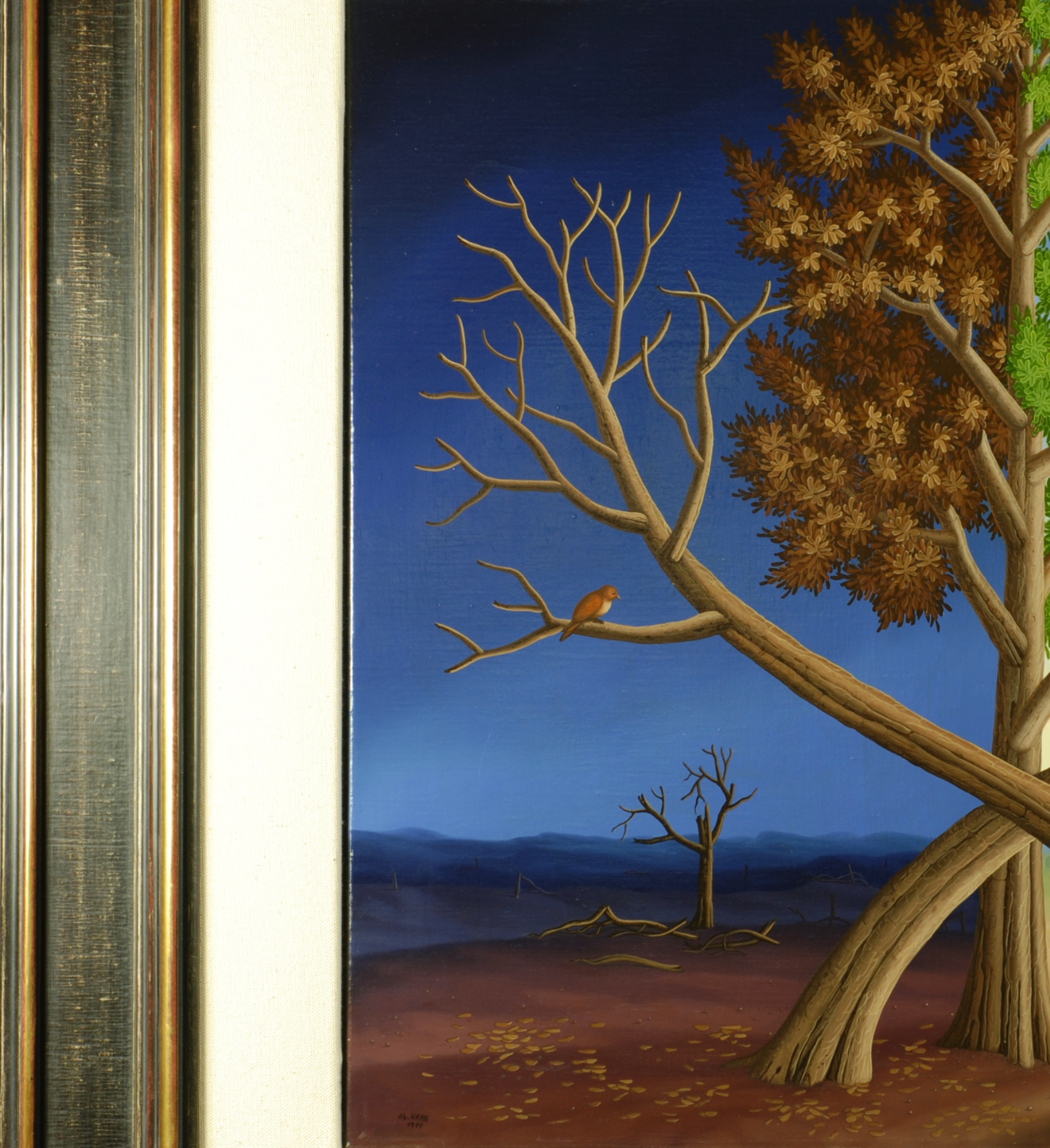 Im Zentrum des Bildes stehen drei Bäume. Der mittlere Baum wächst gerade. Die Baumstämme der beiden äusseren Bäume biegen sich jeweils auf die andere Bildseite. Zu beiden Bildseiten, rechts und links der Bäume, sieht man unterschiedliche Tageszeiten und Landschaften. Die beiden Bildhälften (Tag und Nacht) betonen den Kontrast. Die Gegensätze – oder auch die Polarität – verdeutlichen das Janus-Gesetz. Janus der doppelgesichtige Gott in der römischen Antike. Die beiden verschwenkenden Bäume wechseln nur scheinbar die Gegenseite, bleiben sie doch zeitlebens auf einer – der hellen oder der dunklen – Seite verwurzelt. Das Gemälde verfügt über einen einzelgefertigten Modellrahmen und ist auf der Vorderseite datiert und signiert. Auf dem Rücktitel ist das Ölgemälde betitelt, datiert sowie signiert.