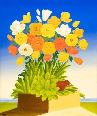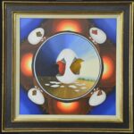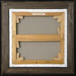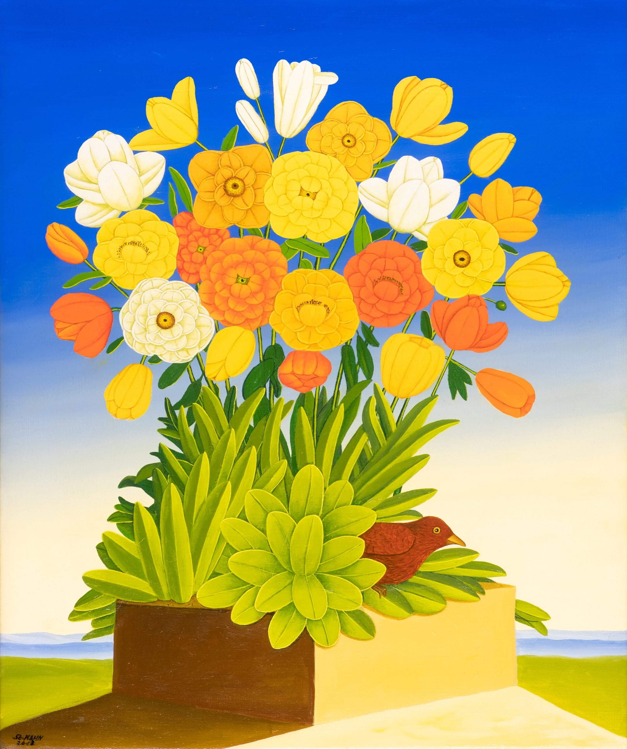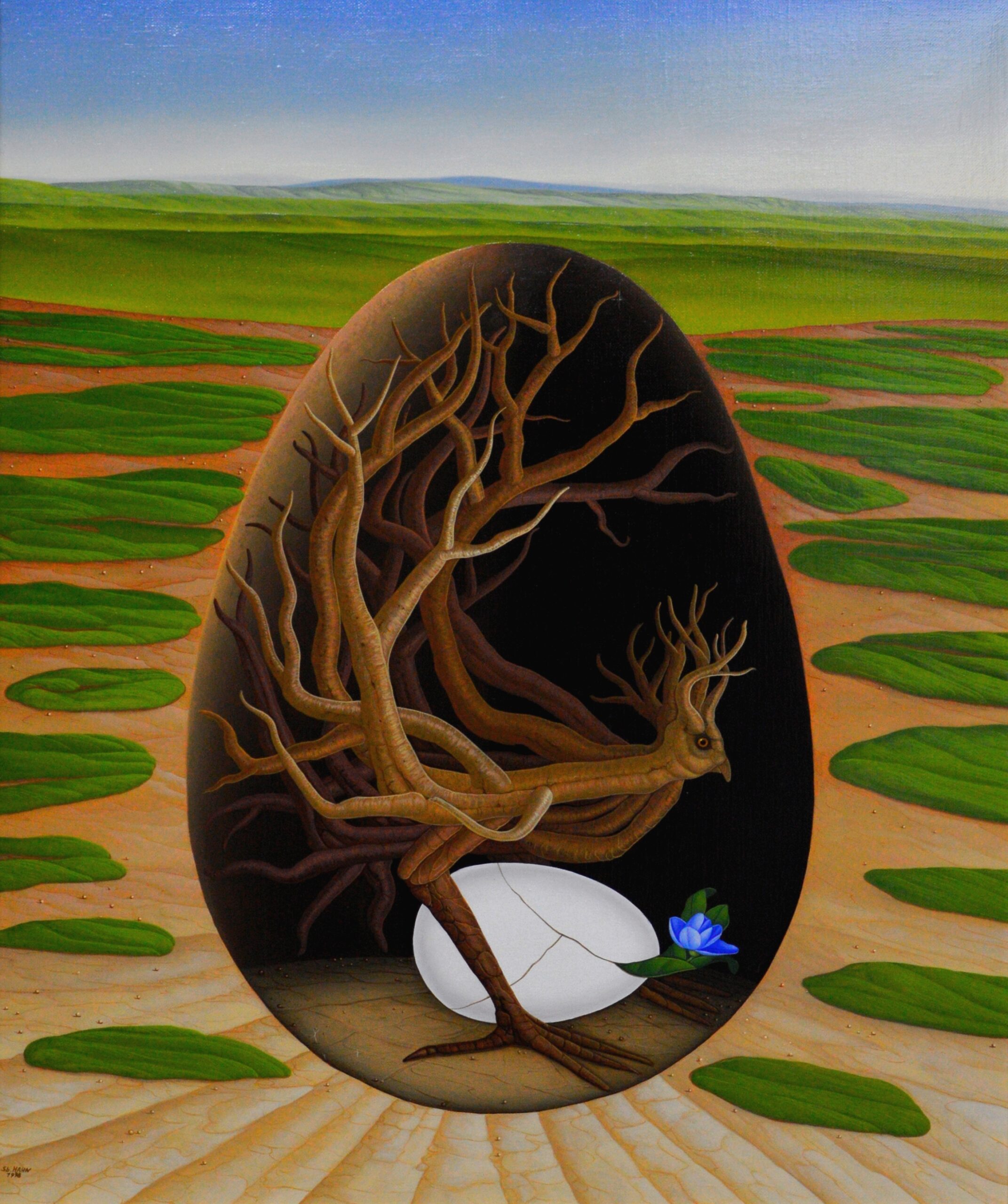 Bei dem Ölgemälde handelt es sich um ein klassisches Tondo. Das Tondo ist ein quadratisches Gemälde, in das ein kreisförmiges Bild hineingemalt ist. So bildet das Quadrat ein Rahmenbild, welches das Innenbild des Kreises umschließt. Das kreisrunde Innenbild zeigt eine steinige Landschaft mit mehreren Felsenstehlen vor einem hellblauen Himmel. Zwischen diesen Steinen wachsen farbenfrohe Blumen und Pflanzen mit gelben, roten und orangefarbenen Blüten. Das restliche quadratische Außenbild zeigt eine karge Steinlandschaft mit großen und kleinen Steinen. Zwischen den Steinen wächst eine Vielzahl von jungen grünen Pflanzen, die sich ihren Weg durch die Steine erkämpfen. Das Gemälde hat einen einzelgefertigten Modellrahmen und ist auf der Rückseite betitelt, datiert und signiert.