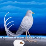 Ein Vogel in der Nacht bewacht sein Ei mit gerade schlüpfendem Küken. Aus dem Ei, dessen Schale gebrochen ist, schaut ein Auge in die graue und dunkle Nacht. Der stahl-blaue Nachthimmel und die karge Landschaft lassen das graue Gefieder des Nachtvogels erstrahlen. Der prachtvolle Nachtvogel wartet auf das Schlüpfen des Nachwuchses. Das Gemälde verfügt über einen einzelgefertigten Modellrahmen.